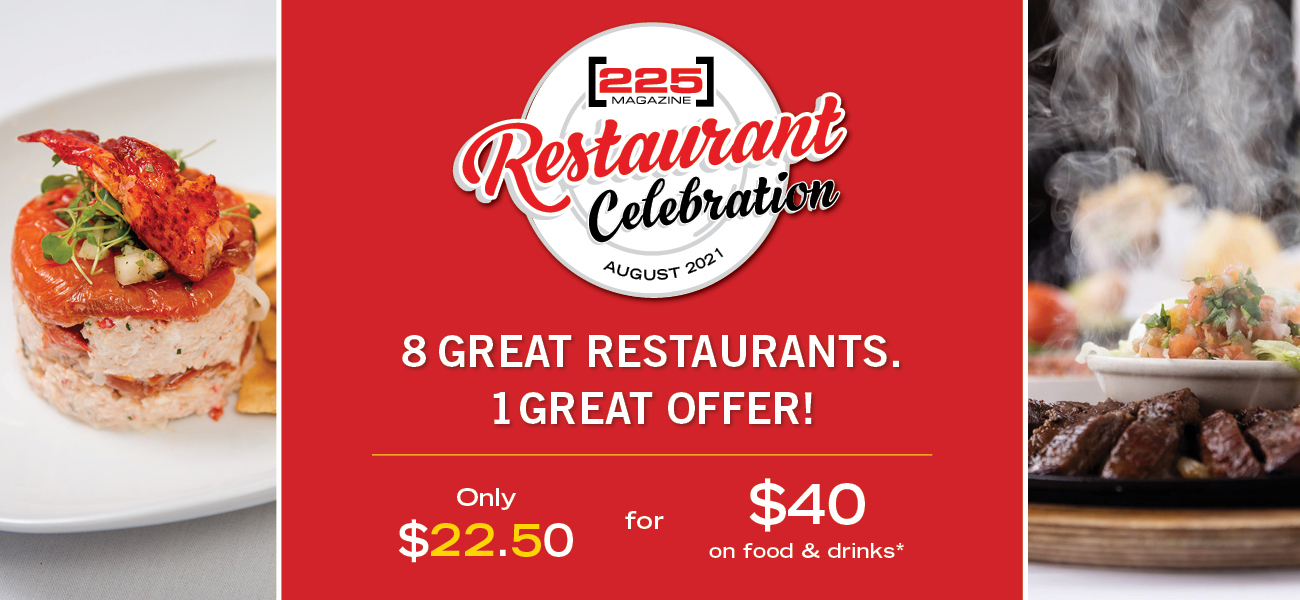 Throughout August, Join 225 Best Eats for the latest 225 Restaurant Celebration. We came up with this new idea earlier this year to benefit your pocketbook and support eight partner restaurants. Eight great restaurants will share one great offer: For only $22.50 (Get it? 2-2-5), you’ll get a $40 voucher to use at any of the participating restaurants. Eat well, and save over 40%. Please view each offer for specific details and restrictions.