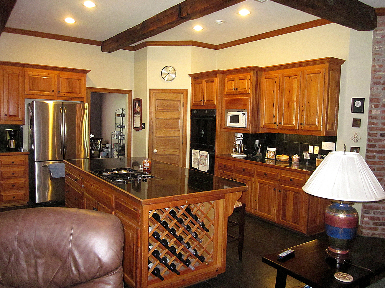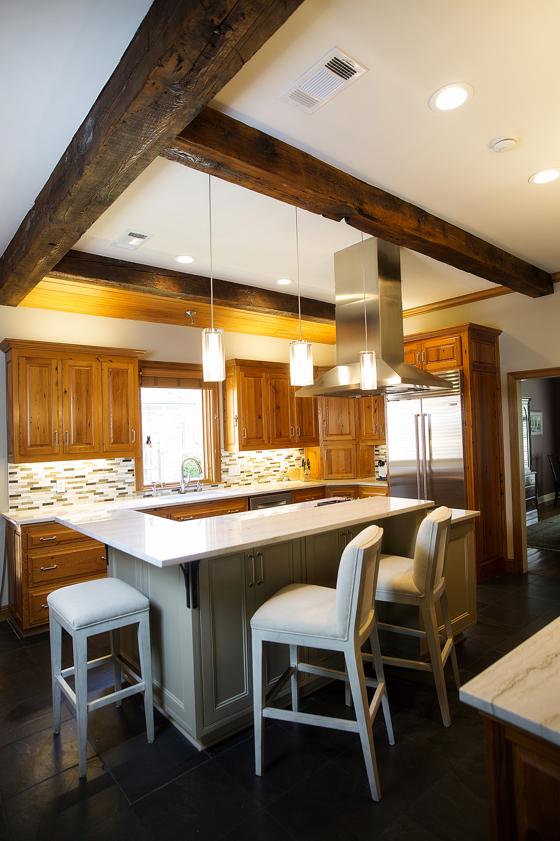 The kitchen’s cozy ambience was modified for a cleaner look. The tile flooring was changed to a dark slate tile. Old fluorescent lighting was replaced with can lights and pendants from Tech Lighting.