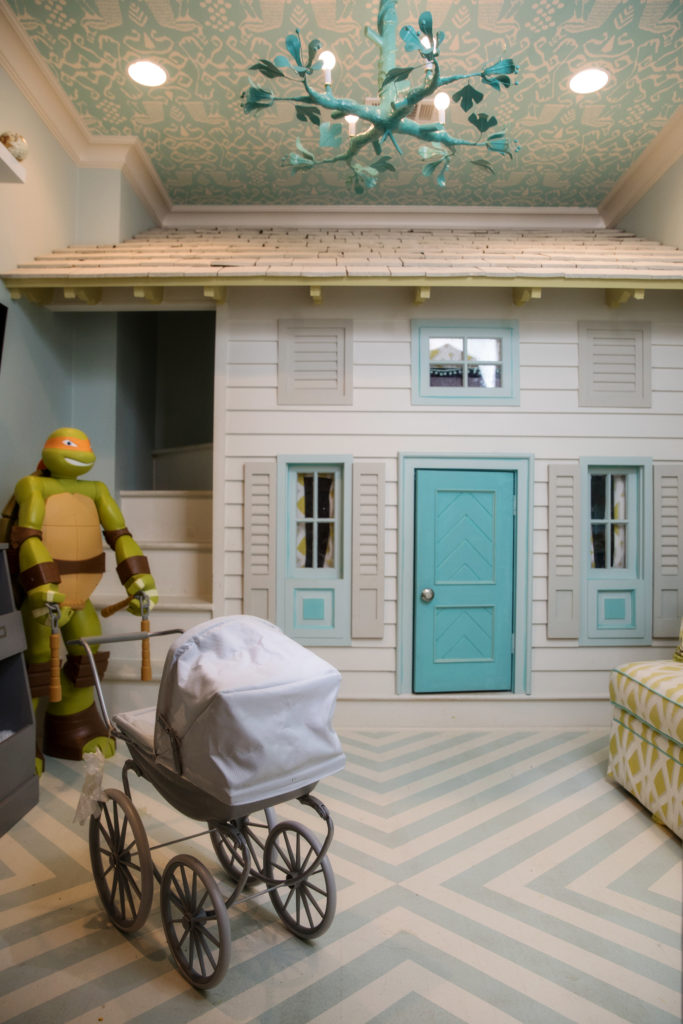 Hill converted some extra space in her living room into a two-story playhouse for her kids. It’s concealed by two folding, leather-studded doors.