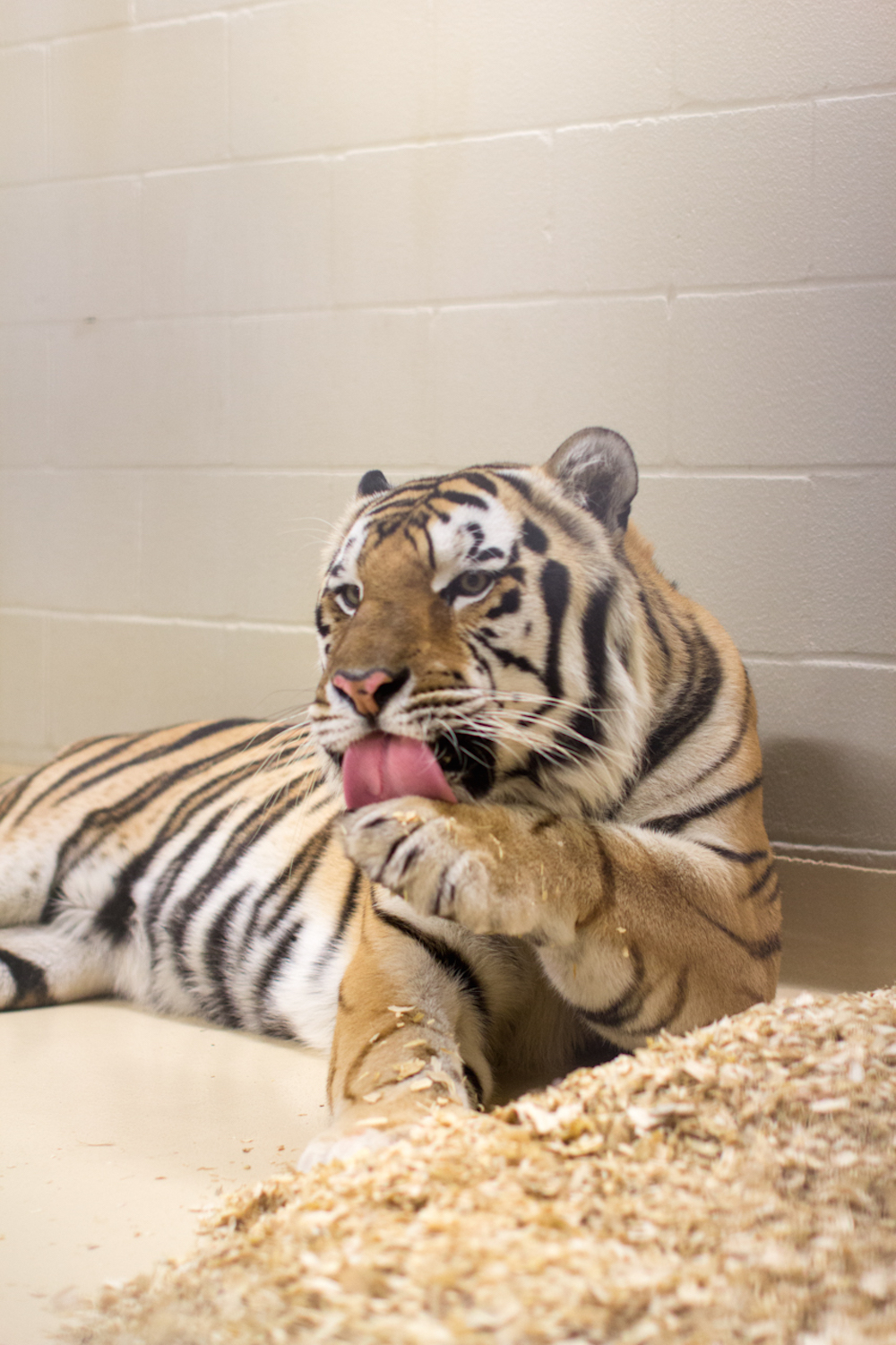 Once satisfied, Mike plopped down next to his bed of mulch-like shavings, until Davis brought out a 30-pound purple ball covered in teeth marks. Conversation got difficult, because Mike repeatedly tossed his toy against the metal walls, making the room ring.