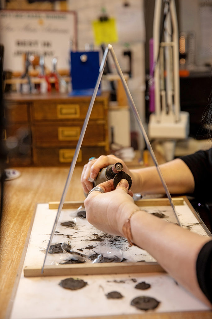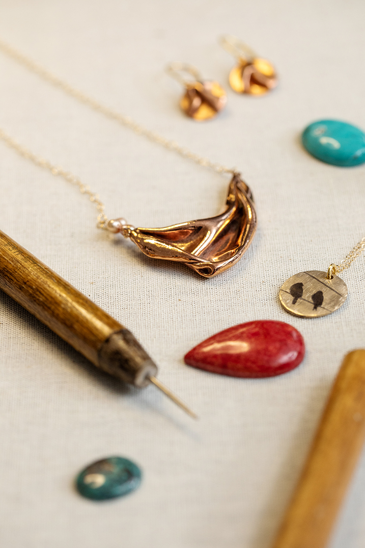 When Andricain shows off her pieces today, you can hear her passion for each one in her voice. She excitedly describes the methods she’s learned and how she’s deployed them along the way. Each item she crafts features unique stones, metals and techniques. She sketches each piece, hand sculpts it and perfects it until it fulfills her vision. The result? Masterfully molded, elegant pieces with delicate details. For her, the company is just as much about personal growth as it is about business.