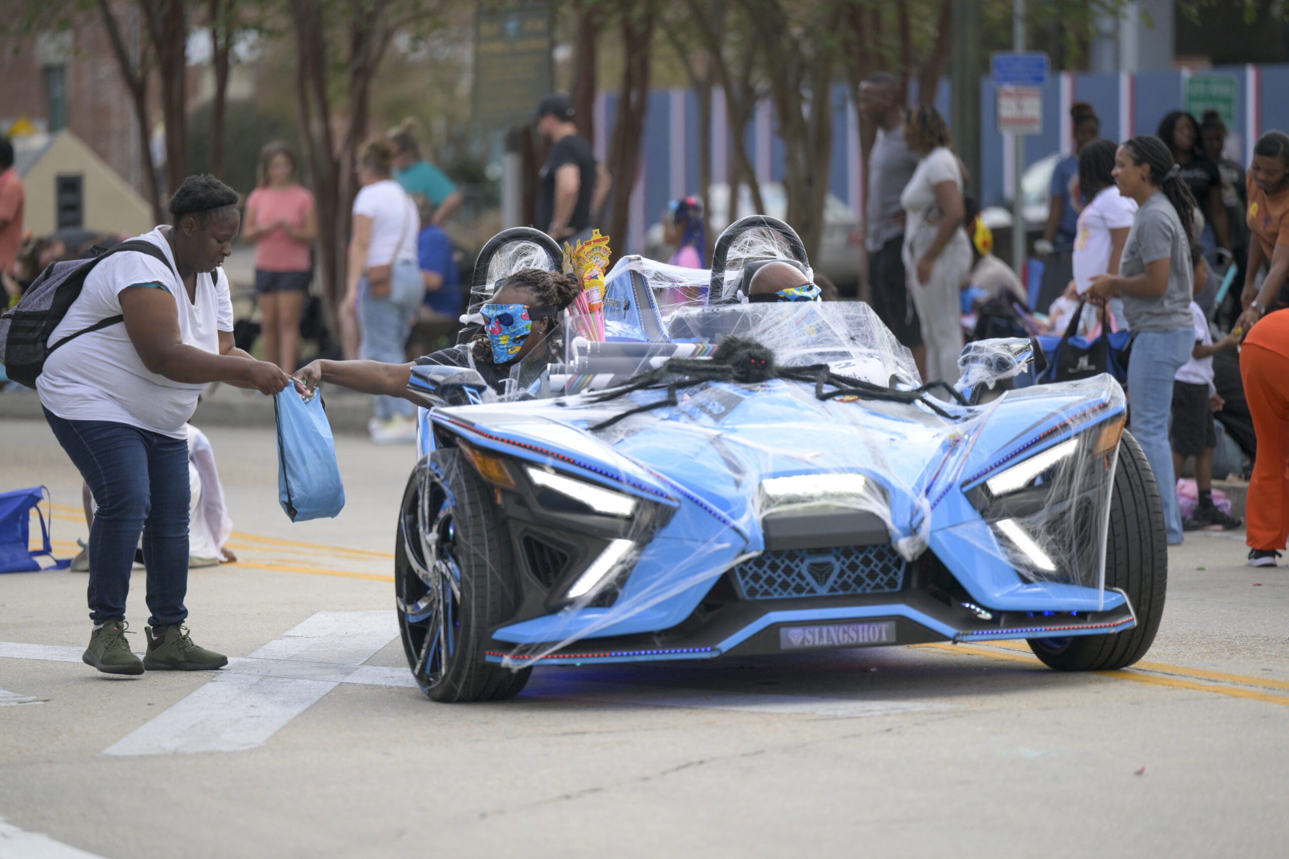 Krewe members ride on 2023 King of the Fifolet Halloween Festival Lance Martin's float in downtown Baton Rouge