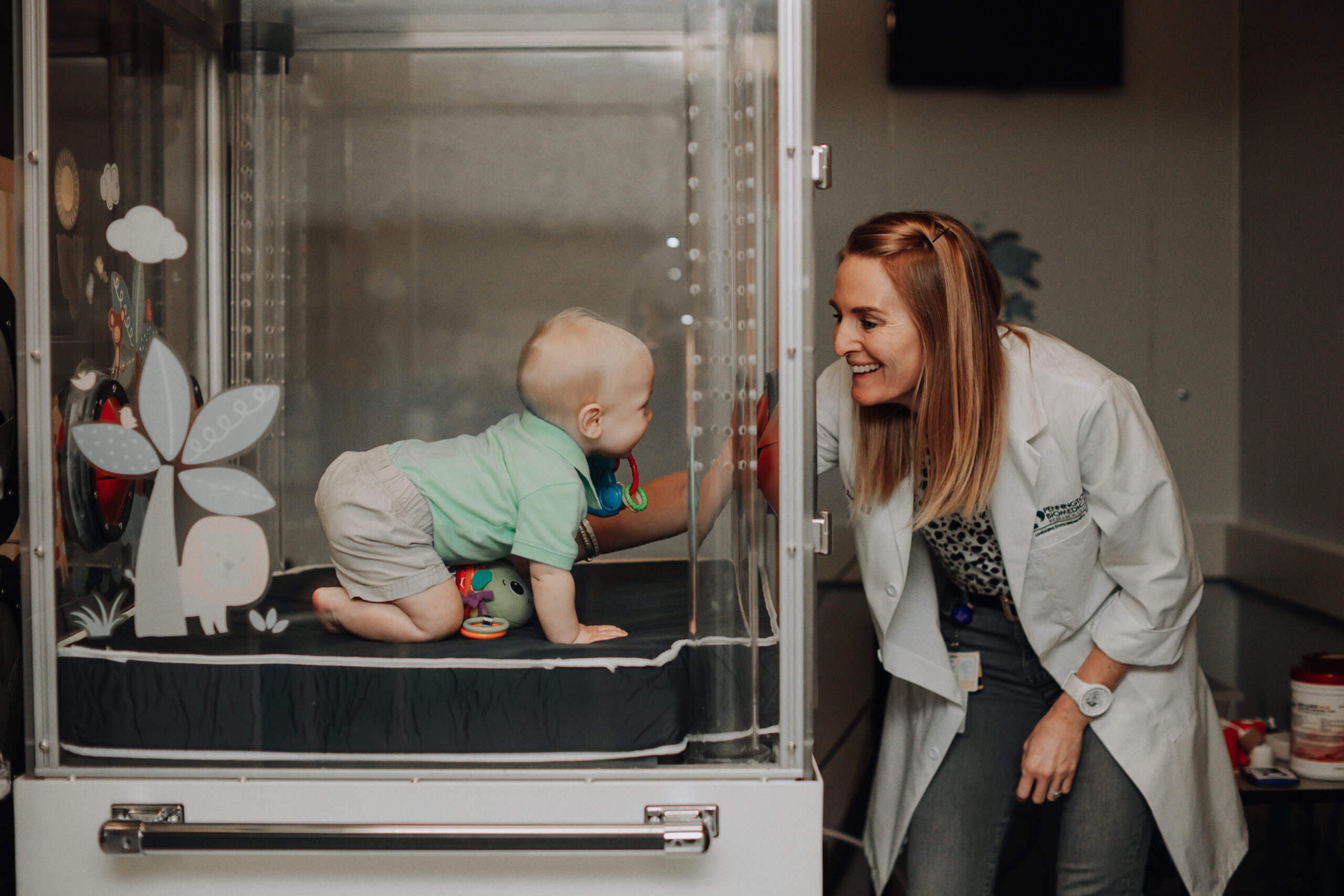 The second measurement is newborn metabolism. Pennington Biomedical is home to the only metabolic chamber in the world sized for infants. To obtain the measurement, the baby is placed inside the clear metabolic chamber, allowing researchers to capture the infant’s entire metabolic cycle. By measuring the amount of oxygen the baby breathes in versus carbon dioxide it breathes out, researchers can estimate how many calories the baby is burning.