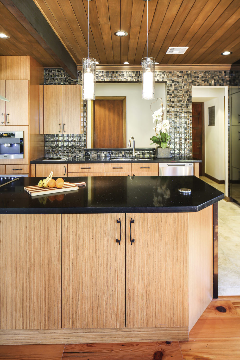 Next, the designer and homeowner built the kitchen concept around teak cabinets. Both warm and elegant, the cabinets worked well with black quartz countertops, stainless steel fixtures and pine flooring.