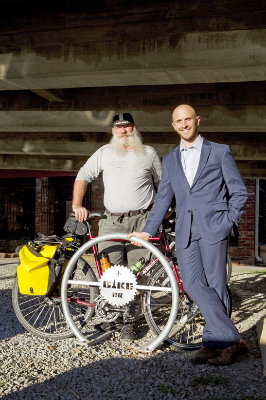 Mark Martin and Beaux Jones of Bike Baton Rouge stand next to one of the bike racks their organization installed in front of Chelsea’s Café. Photos by Collin Richie