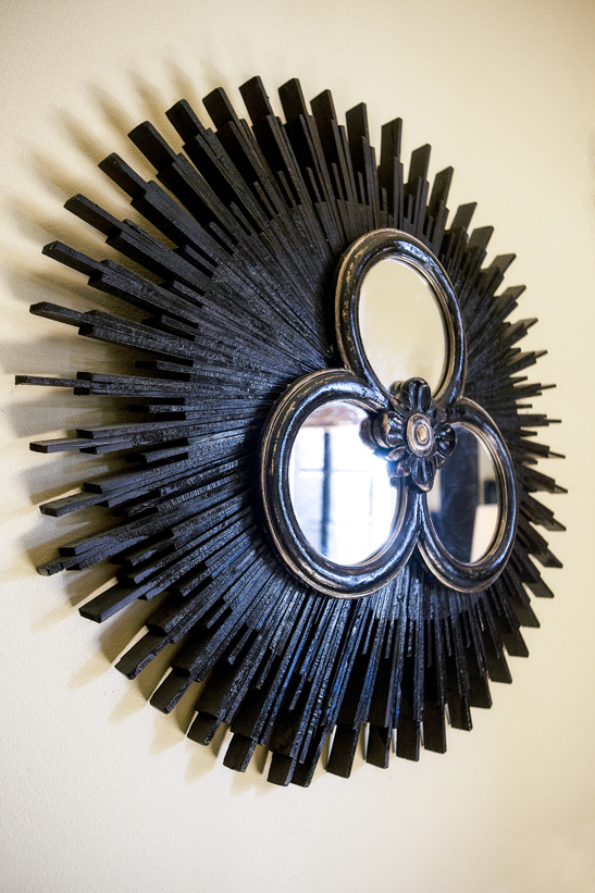 Mirrors: The Olsons have many handmade mirrors throughout their home, some in black or gold sunburst designs and others modeled after French trumeau antique mirrors. Lisa’s mother designs the mirrors, her father builds them and her mother paints them. “There was so much wall space in this house. We needed lots of big pieces. Mom decided: mirrors,” Lisa says.