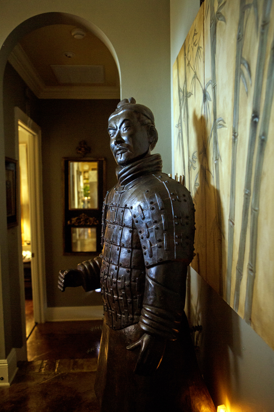 Warrior statue: Shortly after they moved into the house, Lisa traveled to China, Thailand and Cambodia for several weeks. Her mother suggested she shop for a statement piece to put in the foyer—maybe a tapestry or a porcelain piece. She was not expecting a 650-pound crate to arrive following Lisa’s trip. The crate contained a full-size replica of one of the Terracotta warriors that Lisa found at a shop in Xian. “It is quite a conversation piece,” Lisa says.