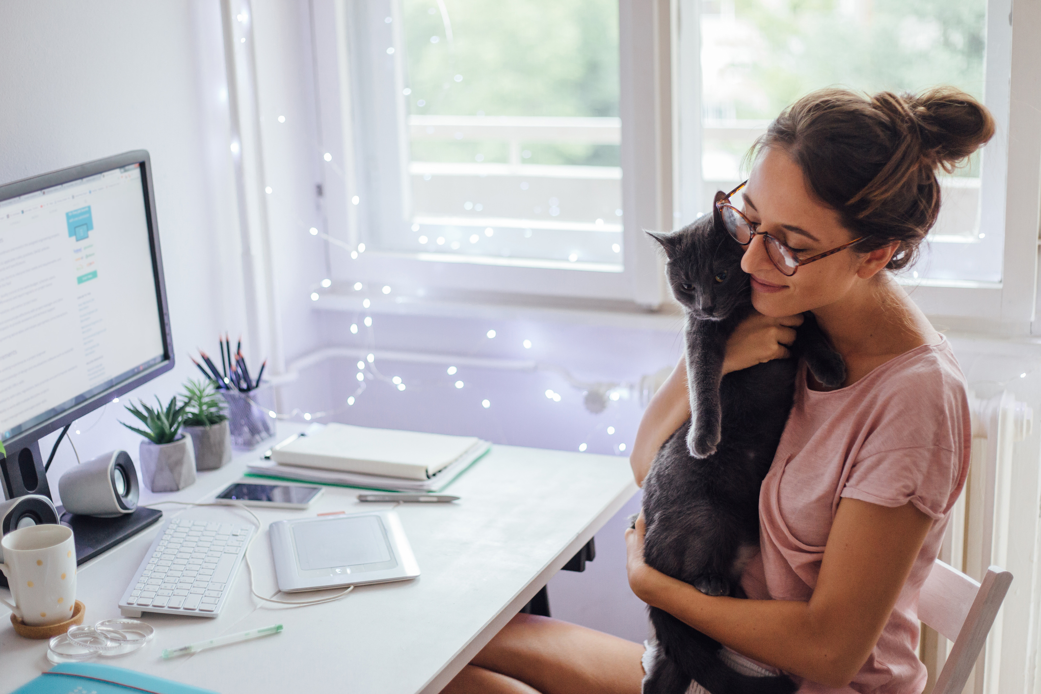 While many pets love their humans working from home, some may need a little space to adjust. The workday can be as long for your cat as it is for you, and their boredom is real. Be sure to pause throughout and take time to play with your cat. If you don’t want to have to hold the other end of the string toy or toss the ball, choose toys that kitty can play with alone. Never underestimate the power of an empty box or paper bag on the floor—your cat will immediately have to explore it—so you can get a little time to get some work done.
