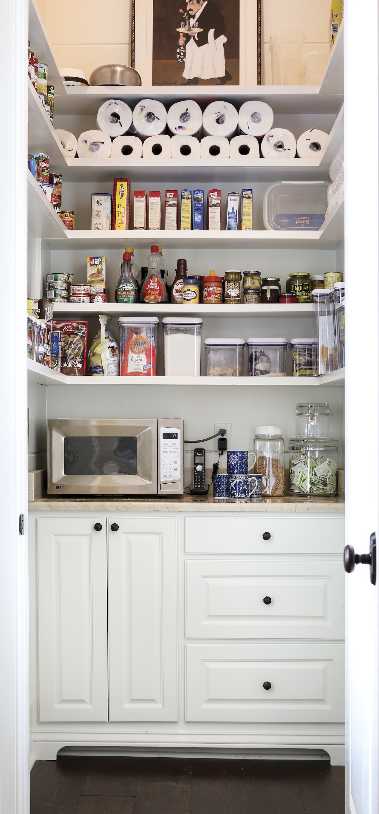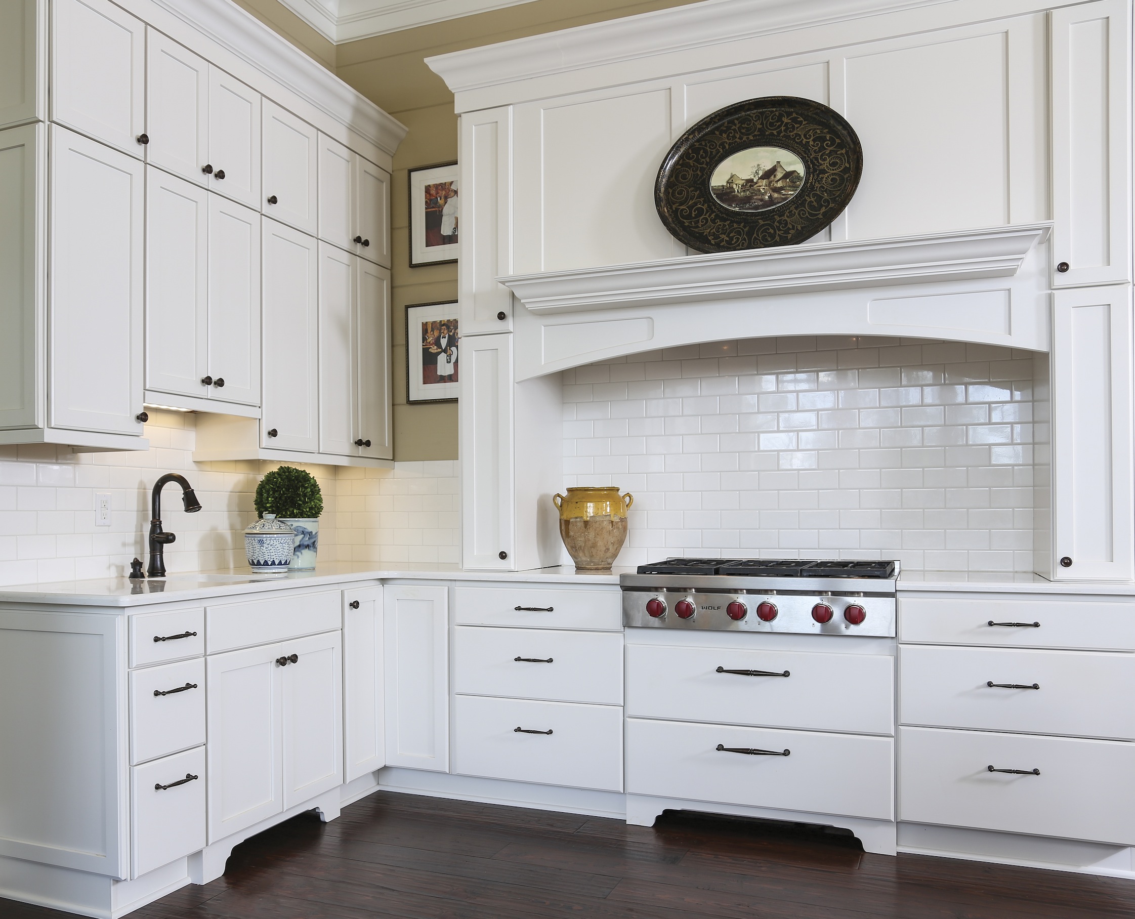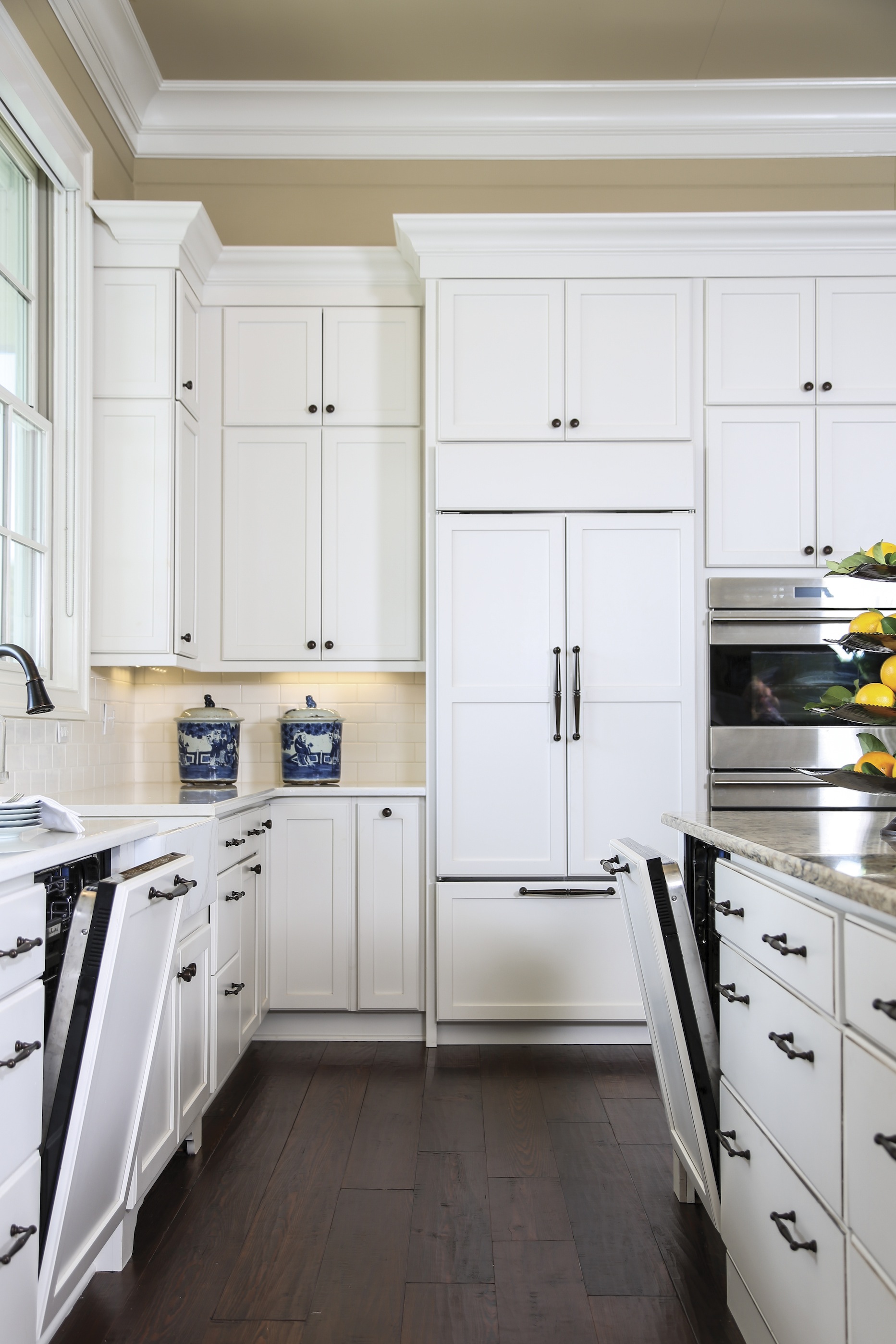 Kathy Simoneaux and Adele Merchant of Acadian House Kitchen and Bath Studio were the designers for the Magnolia, Mississippi, vacation home. Simoneaux had worked with the Culottas before and had an idea of what was important to the couple: sufficient appliances, including two dishwashers and a built-in microwave, pantry space and lots of white cabinets. The dramatic white kitchen reflects Carolyn’s interest in staying classic. Her Baton Rouge home, by contrast, has dark cherry kitchen cabinets.