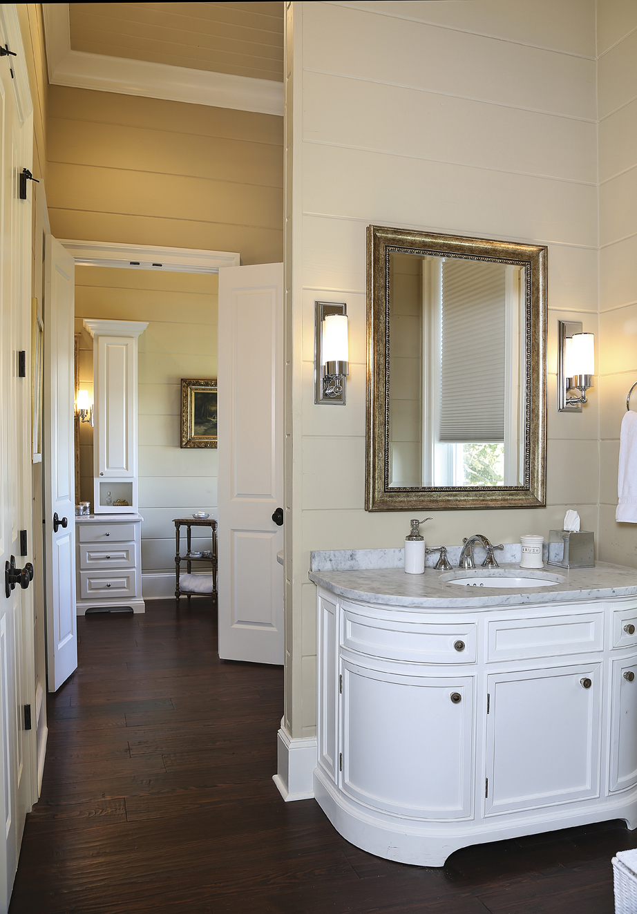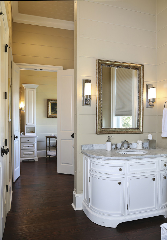 Dresser mirror. In Carolyn’s dressing area, an oversized decorative mirror that she found while antiquing is the centerpiece of the dressing table. It’s a reproduction of an antique but was an excellent purchase at Inessa Stewart’s.