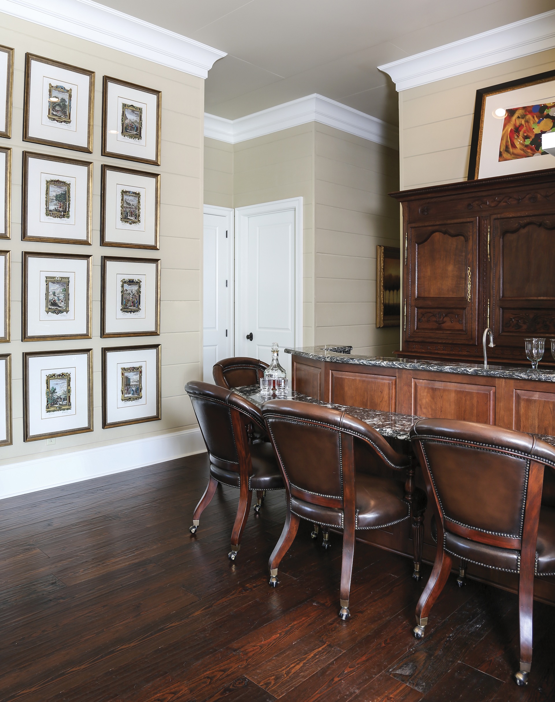 Triple armoire. Carolyn envisioned a large armoire for storage behind the bar. She found exactly the one she wanted—with perfect dimensions and color—at Crown and Colony Antiques in Fairhope, Alabama.