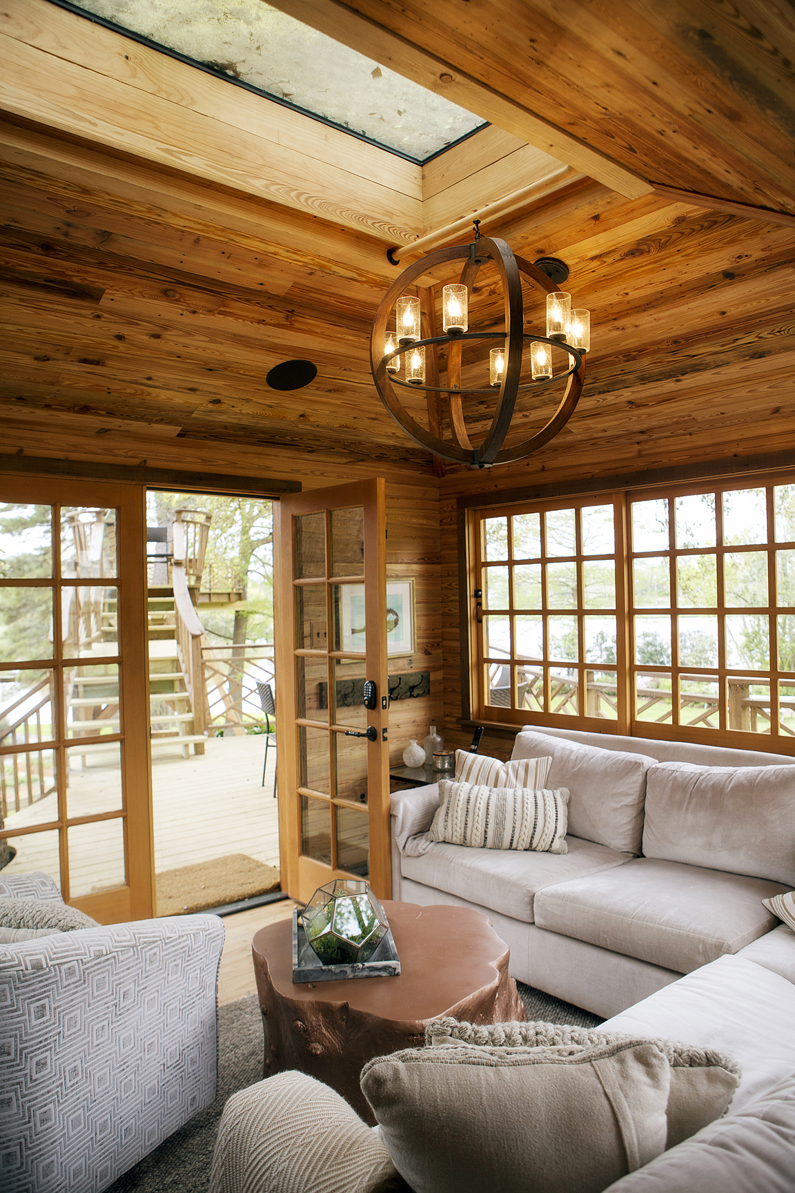 Wood: Is there a better building material than wood to use in a treehouse? Plenty of wood, inside and out, gives the house a warm and cozy atmosphere. It’s built from reclaimed Louisiana heart pine and cypress, with some Washington western red cedar to boot. The bar top, for example, is a smooth expanse of red cedar specially cut by a friend of builder Pete Nelson.
