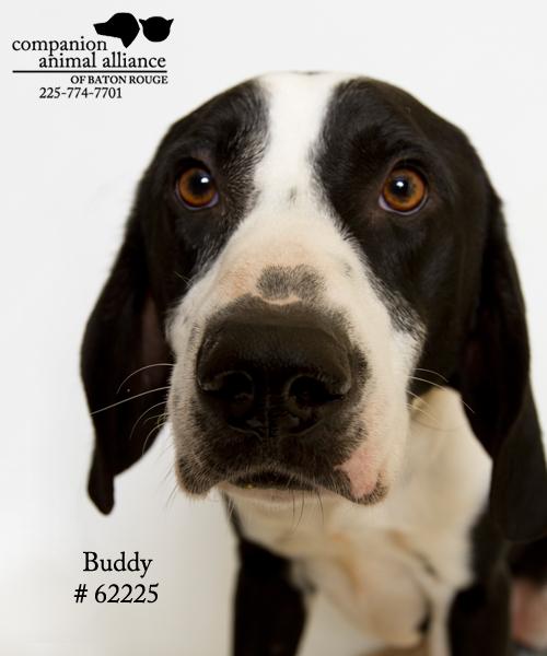Buddy (#62225) is a large, young male hound mix with soulful brown eyes.