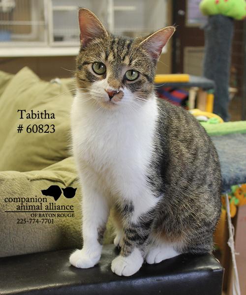 Tabitha (#60823) is a friendly young, adult female brown and white tabby.