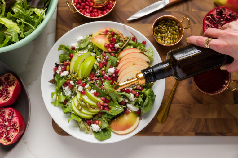 Our fresh salad recipe with a tangy pomegranate vinaigrette is perfect for fall