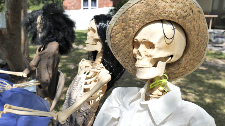 A local couple is arranging weekly skeleton scenes in their Woodland Ridge yard