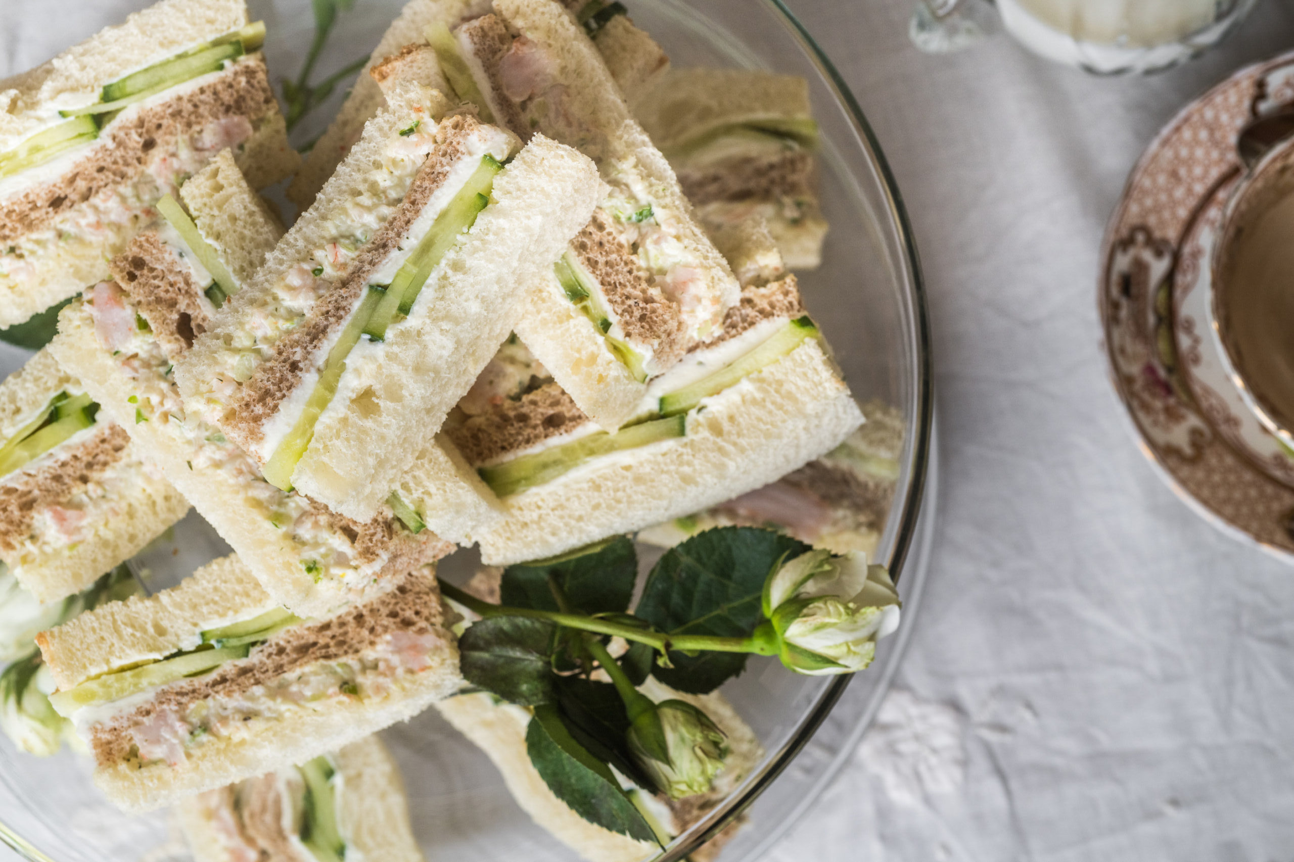 The tea sandwich, also referred to as a finger sandwich, is an essential part of traditional English afternoon tea. They were served as the first course at teatime before scones and cakes. Typical fillings and flavors of a tea sandwich were light and simple in flavor. Popular fillings are usually thin-sliced cucumber or radishes with butter. Others may be a simple egg salad with a little watercress and smoked salmon. The purpose of a bite-size tea sandwich was to tide one over between the long lapse between lunch and a formal dinner, which was served in high society at 8 p.m.