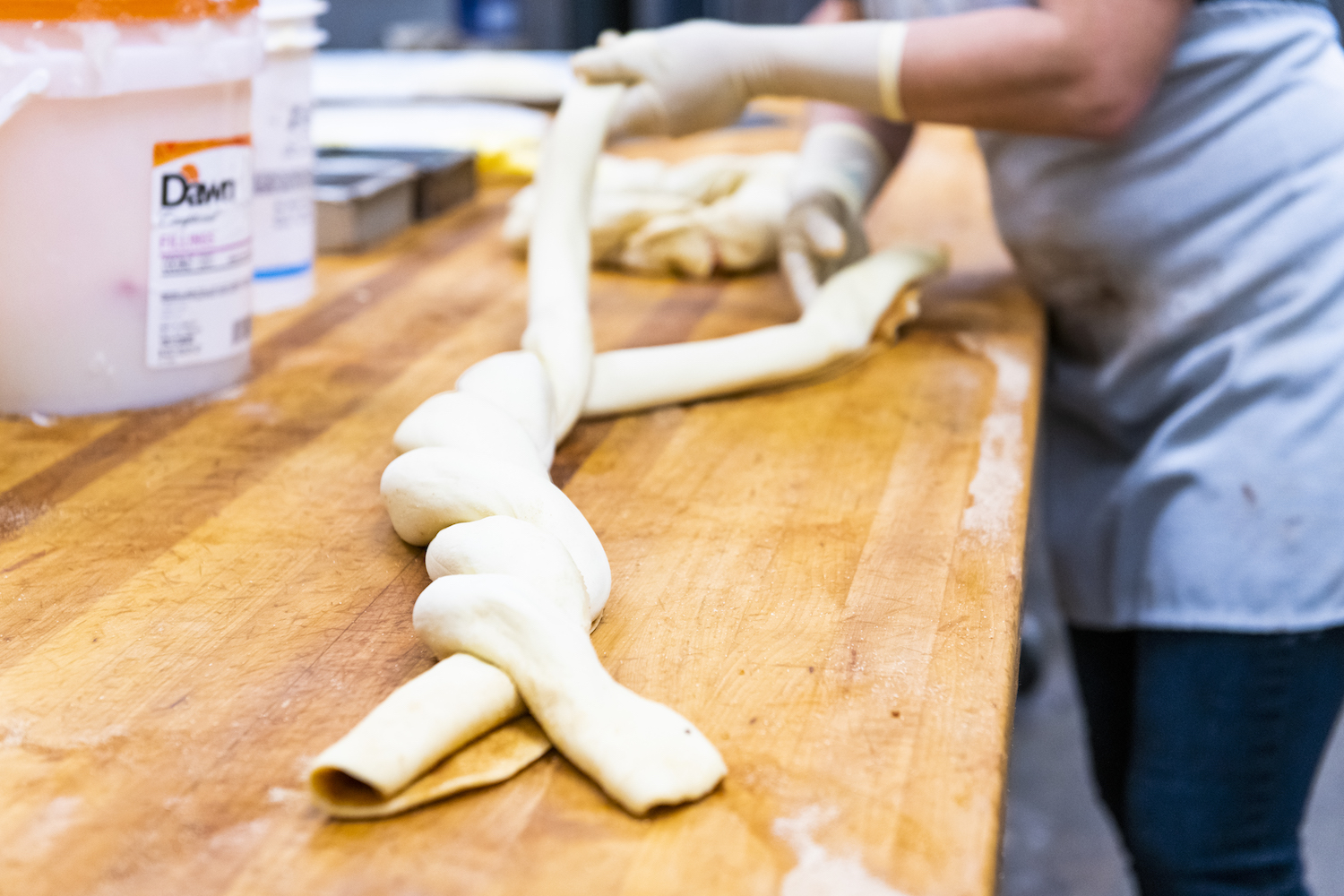 We usually have around 60—come king cake season, we have close to 100. The thing is is that every one of our king cakes are handmade. There’s actually a video on YouTube that kind of gives you an idea. Every king cake is handmade, and it’s not made by a machine. I mean, we use machines to make part of it [such as mixing the brioche bread dough], but the overall king cake is all done by hand.