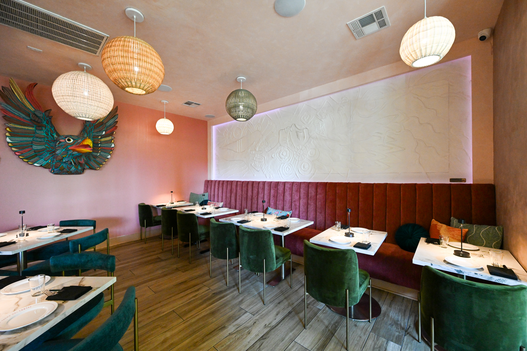 The popular New Orleans area eatery soft-opened April 17 at Perkins Rowe inside the former Habaneros space. Tacos del Cartel is known for a showy dining experience, with fire-breathing bartenders, out-of-the-box cocktail glassware and more. Diners are greeted with lush greenery and bright pink flowers overhanging the walkway. The food menu pulls inspiration from all over Mexico. The rich tacos de birria, which are rooted in the traditions of the Mexican state of Jalisco, are slow-cooked for hours and served on a traditional Mexican clothesline with the restaurant’s signature consommé.