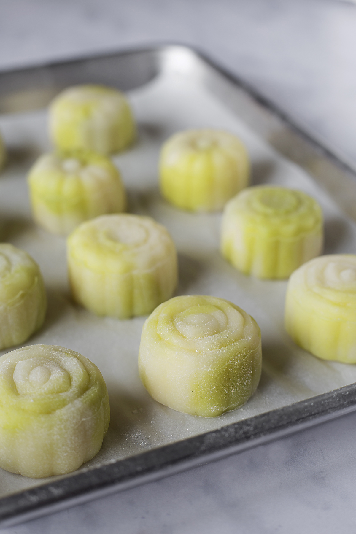 Their site features a range of different artfully presented recipes, including one for snowskin mooncakes with custard filling, a sweeter, smaller mooncake than the ones found in stores. It’s covered in tender rice flour pastry, and its floral designs are formed with decorative presses.