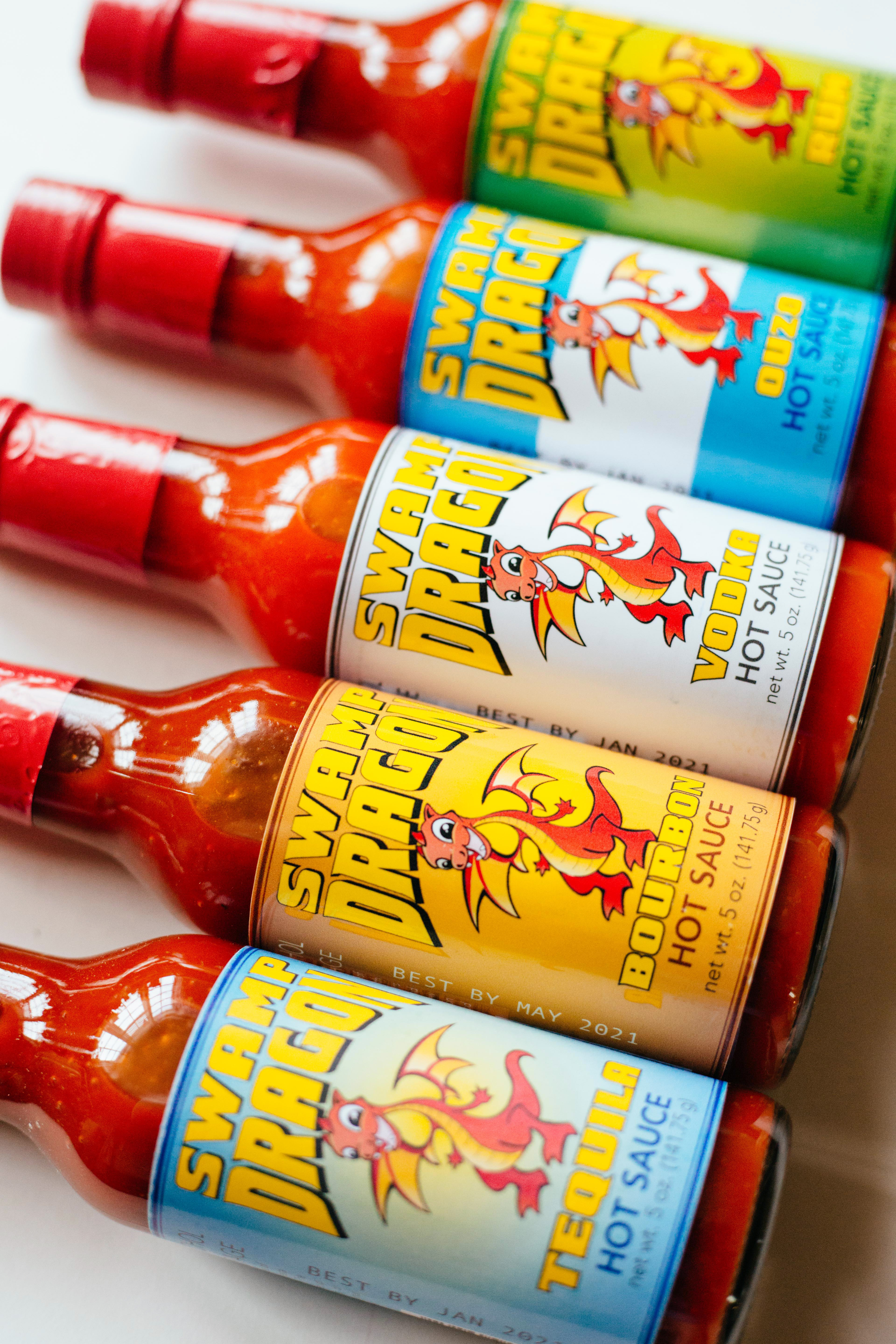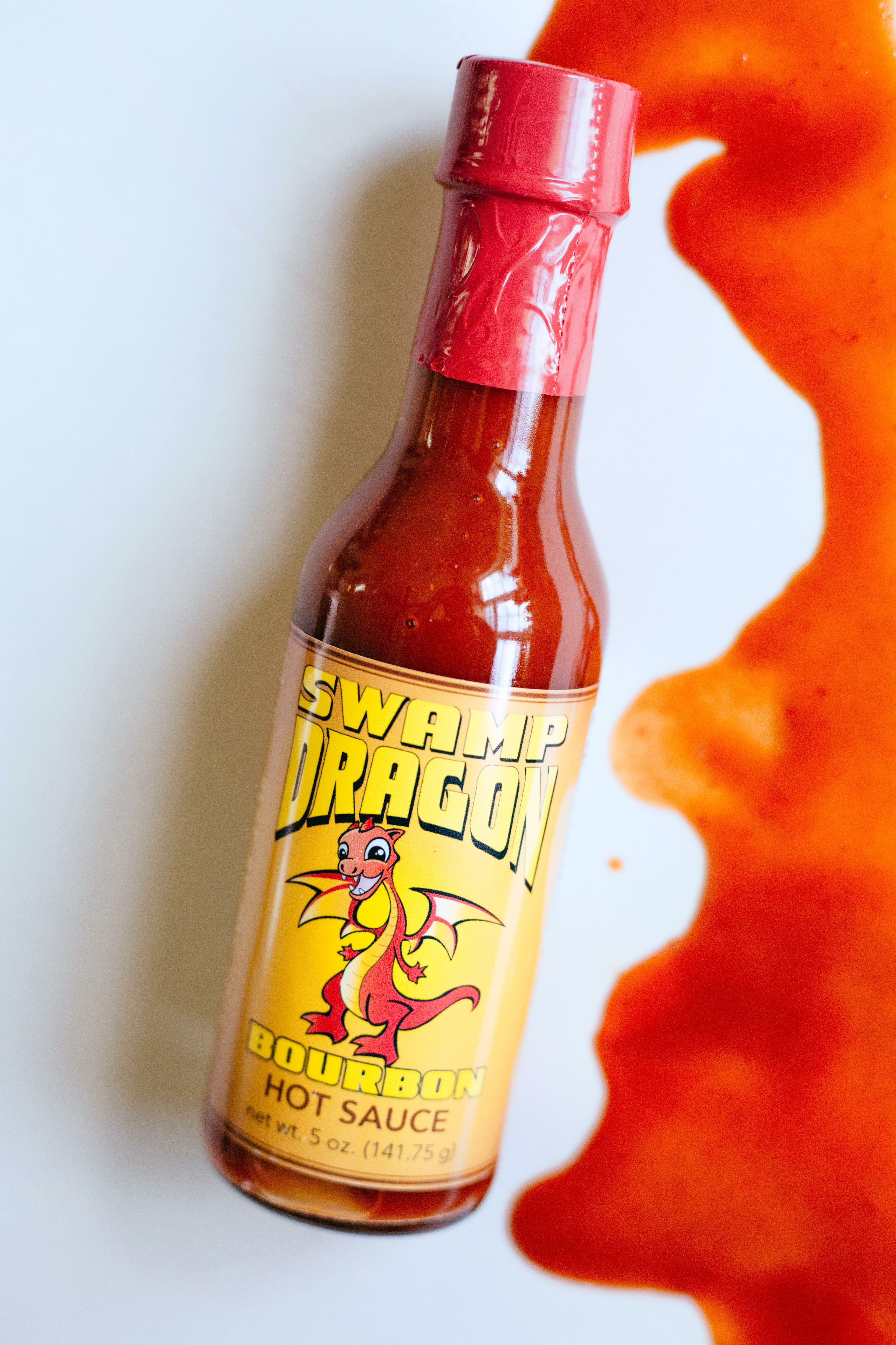 After years of research and months in the LSU Food Incubator, Beeson developed the final Swamp Dragon recipe while experimenting in his kitchen one weekend. “I sat down with my wife on a Saturday and was like, ‘Throw the rulebook out the window. Let’s just mix some stuff up,’” he says. He kept mixing peppers until he got the heat index he wanted, and Swamp Dragon was born.