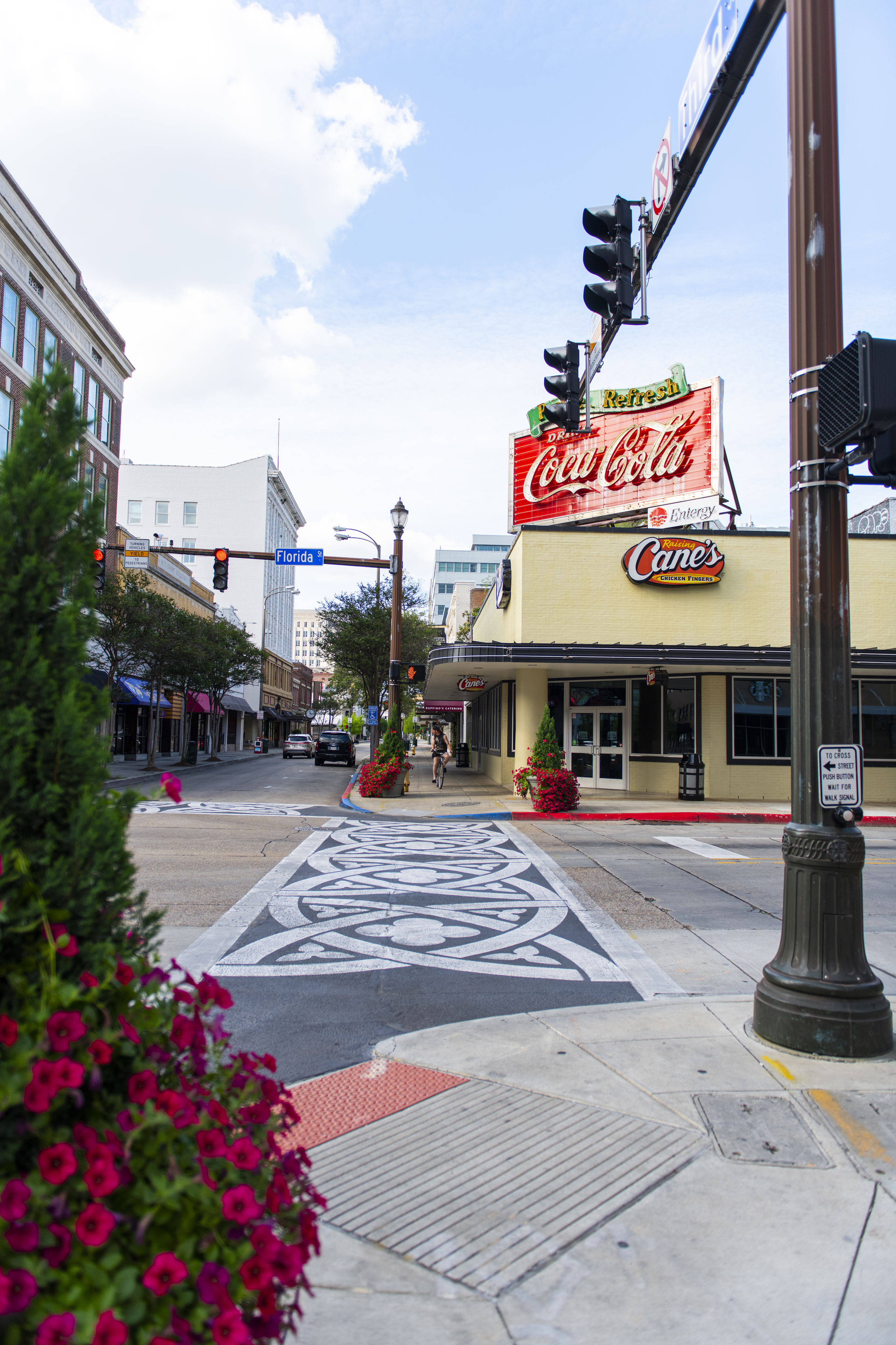 Continue the blast from the past with a cruise down Third Street, where the historic Watermark Hotel stands tall and the classic Coca-Cola sign casts its glow over Raising Cane’s and Schlittz & Giggles. It’s all in stark contrast to the street’s modern and futuristic Shaw Center for the Arts.