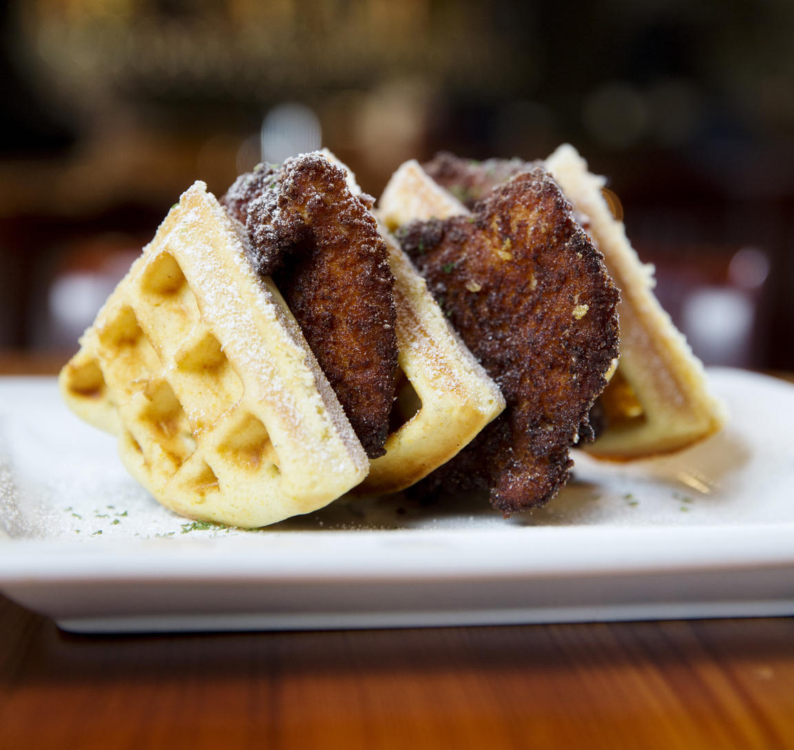 Dessert is all about saving the best for last, but let’s forget about that rule on Sunday mornings. Bread pudding becomes breakfast in this dish: French toast stuffed with mixed berry compote and topped with cream cheese frosting, strawberries, blueberries and powdered sugar. If savory is more your thang, you can’t go wrong with chicken and waffles—cornflake-battered chicken thighs stacked between smoked cheddar-and-banana pepper cornbread waffles and topped with jalapeño herb butter and maple bourbon drizzle. Enjoy it all while watching the game on the big screen.