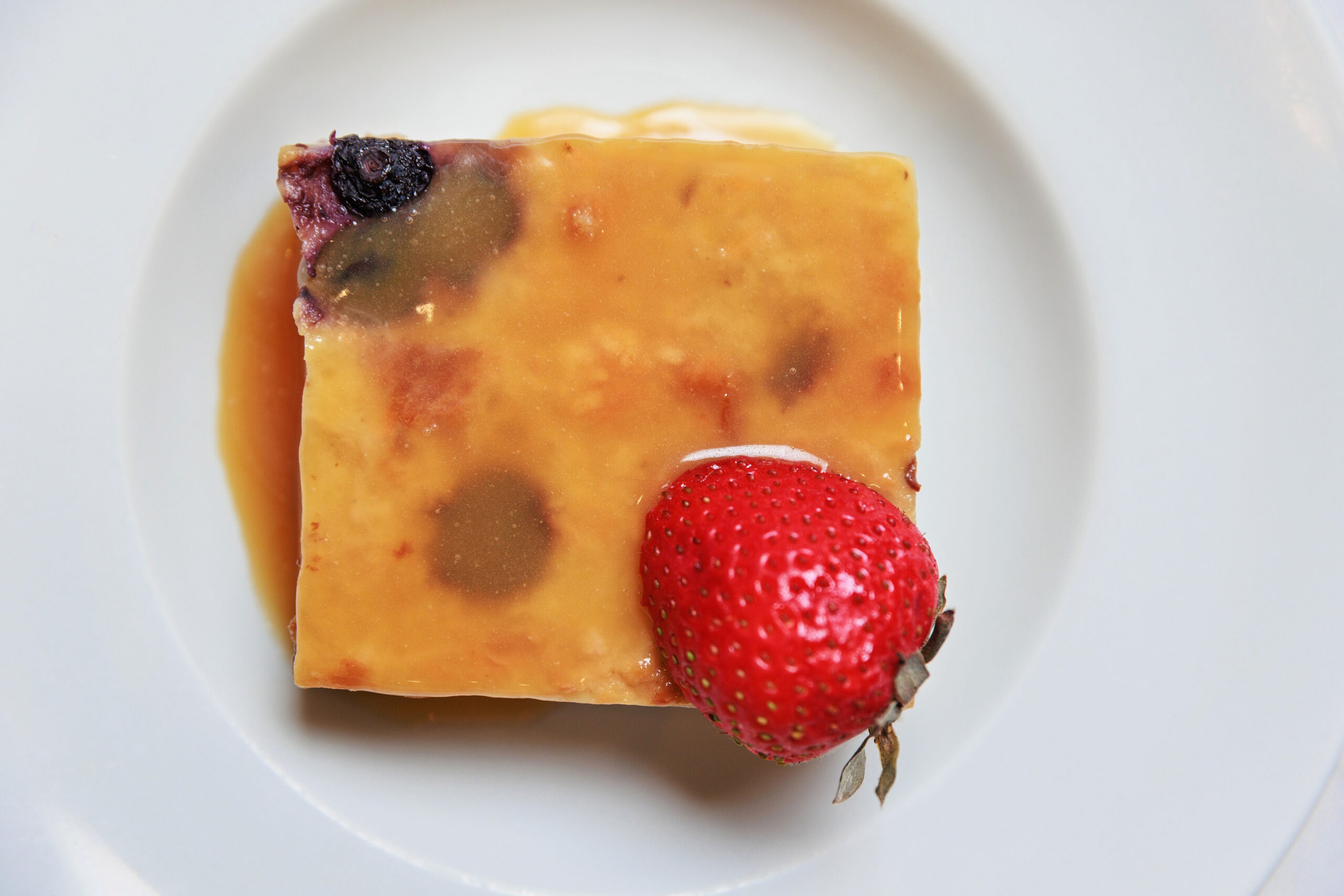 The recipe starts with day-old bread, as stale bread is typically considered the best base for sopping up the flavors in the resourceful recipe. The bread chunks are soaked in a custard base of eggs, milk and sugar and mixed with raisins and blueberries. Once baked, each slice is slathered in a layer of caramel made of brown sugar, Grand Marnier, triple sec and orange juice.