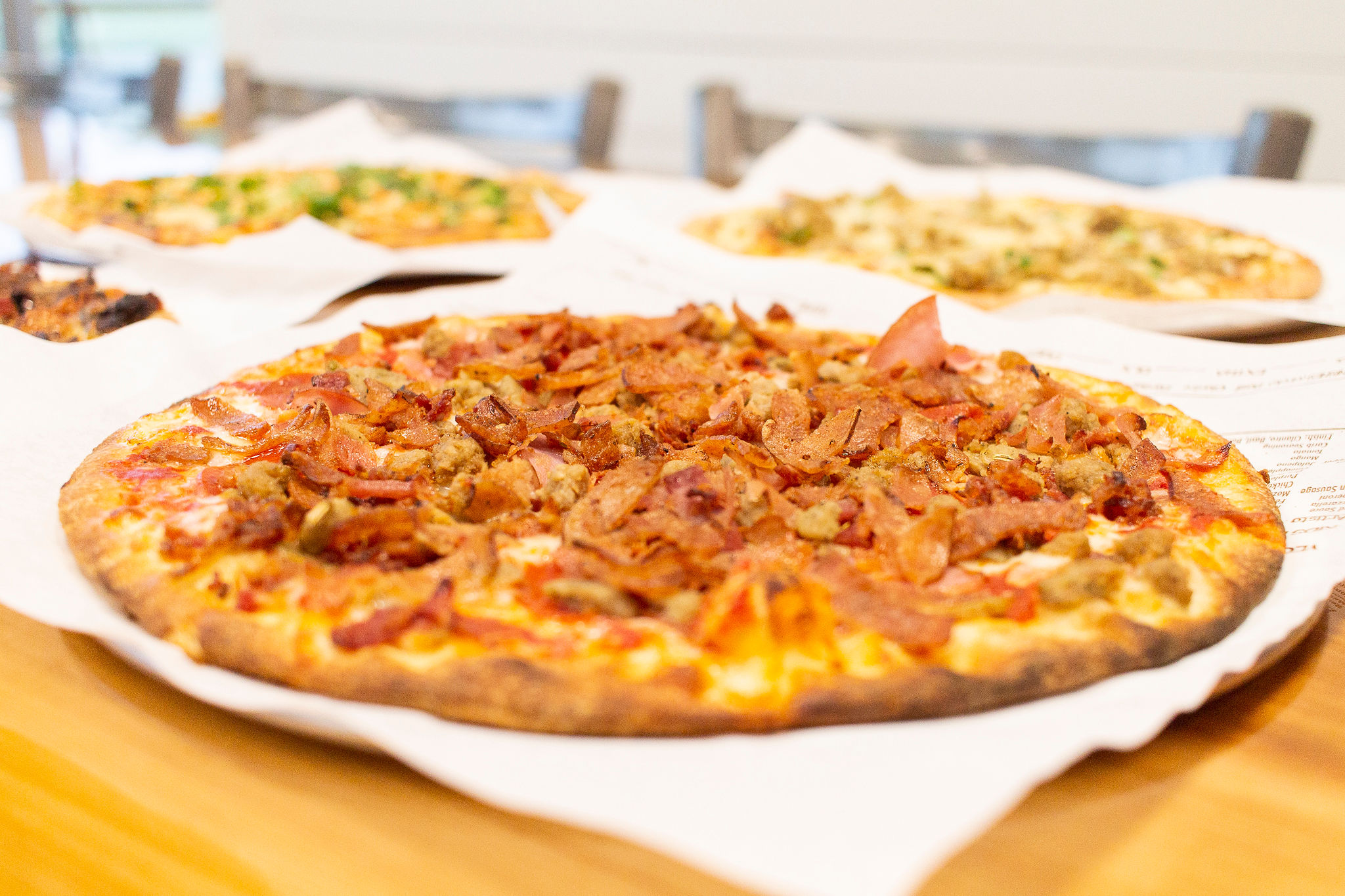 Actually, no. McKlaskey and his partners, wife Cynthia McKlaskey and Kirk Miller, developed a crust formula that holds up with toothsome confidence, no matter how many meats, veggies and extra stuff you pile on. Each pie is fired in full view while you wait, and is ready in less than four minutes.