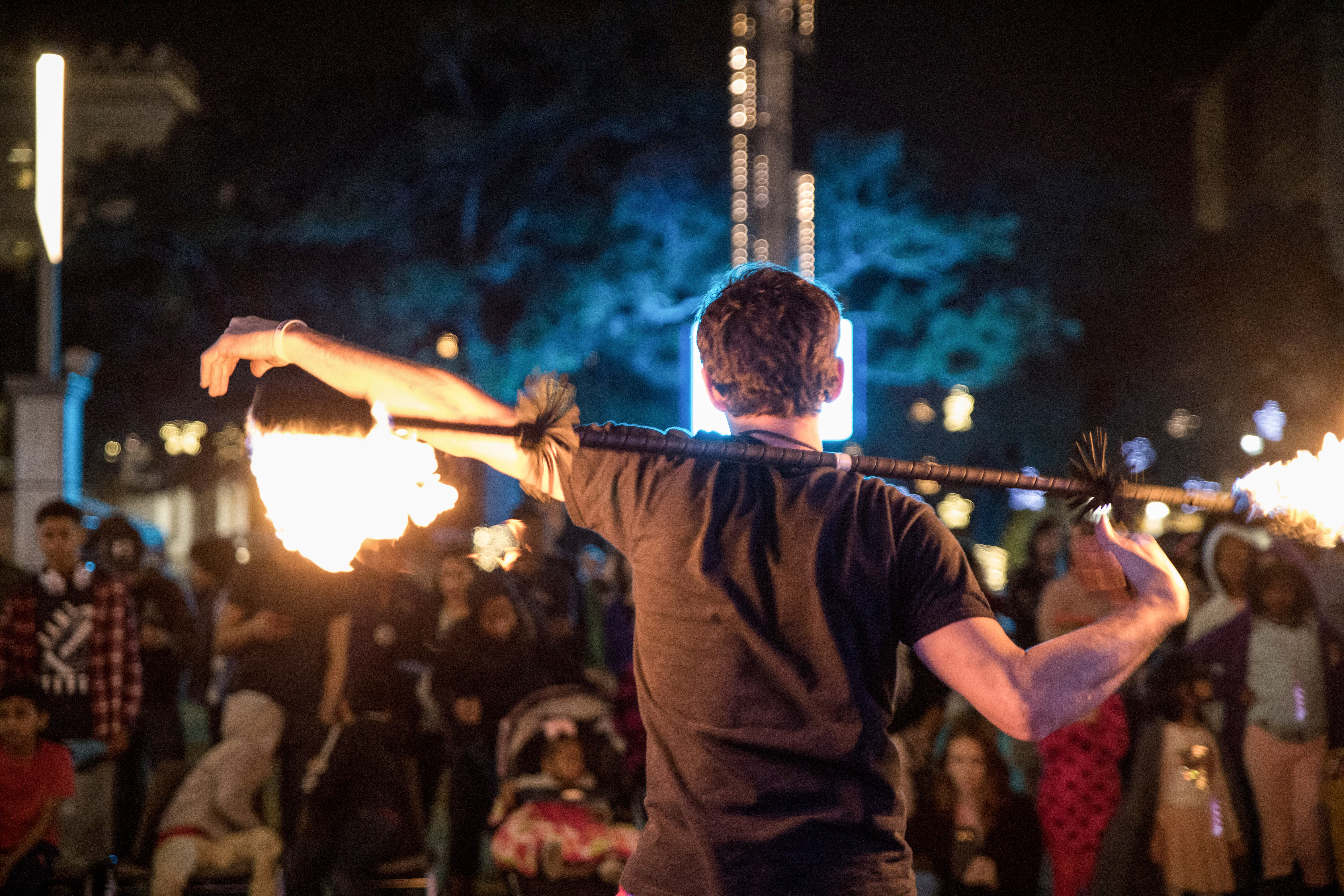 Roberts was inspired by how people drive through neighborhoods to look at Christmas lights and thought it could work for an art show setup, too. Zumo will bring additional works of art, which will be up for sale. Bayou Cirque will handle the high-flying entertainment.