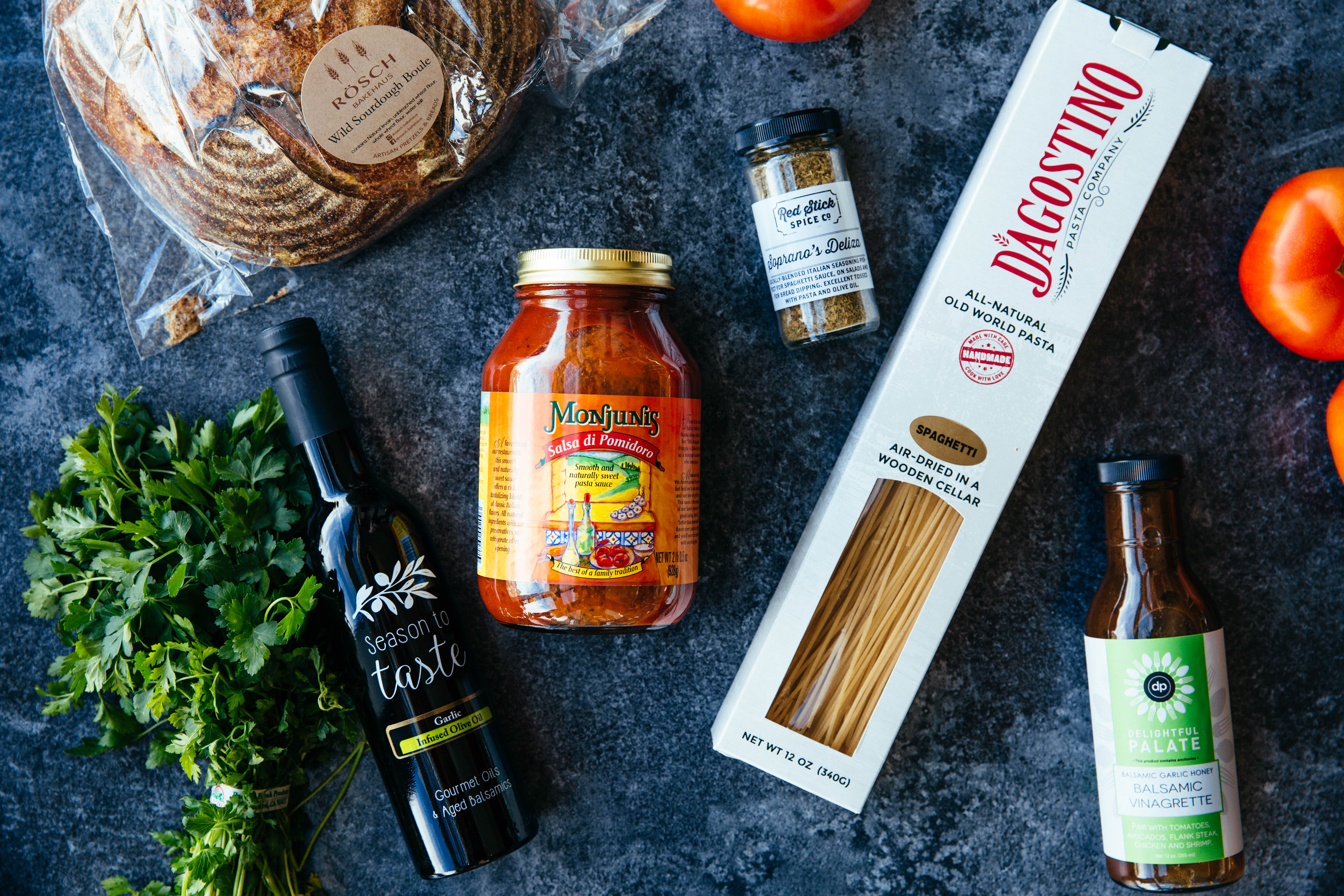 Dining in doesn’t have to mean making everything from scratch. Sometimes we just don’t have time. And OK, some of us don’t have the skills, tools or ingredients to make a sourdough loaf or roll pasta by hand. So we get by with a little help from our local friends. Stocking up on Baton Rouge-made food products makes cooking easier all while supporting the businesses we already know and love. Our take on pasta night requires little more than boiling, tossing and stirring—but it’ll taste just as fresh and delicious.