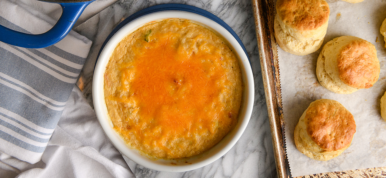 Twice-baked potato casserole is one of my family’s favorites. It is easy to throw together, feeds a crowd and is the perfect complement to pot roast. However, now that so many of us shy away from excess carbs in our diet, potatoes may be a side dish to pass on. Recently I began substituting riced cauliflower in place of my starchy side dishes, like potatoes or rice. Cauliflower has about a quarter fewer net carbs per serving than mashed potatoes. The mild flavor in riced cauliflower lends itself to be the perfect substitute in place of potatoes. The addition of a little cornstarch and milk blended together binds the cauliflower, keeping the consistency smooth and creamy. I fold in a little sour cream along with the other ingredients found in a traditional twice-baked potato recipe to make this low-carb version taste very much like the original recipe.