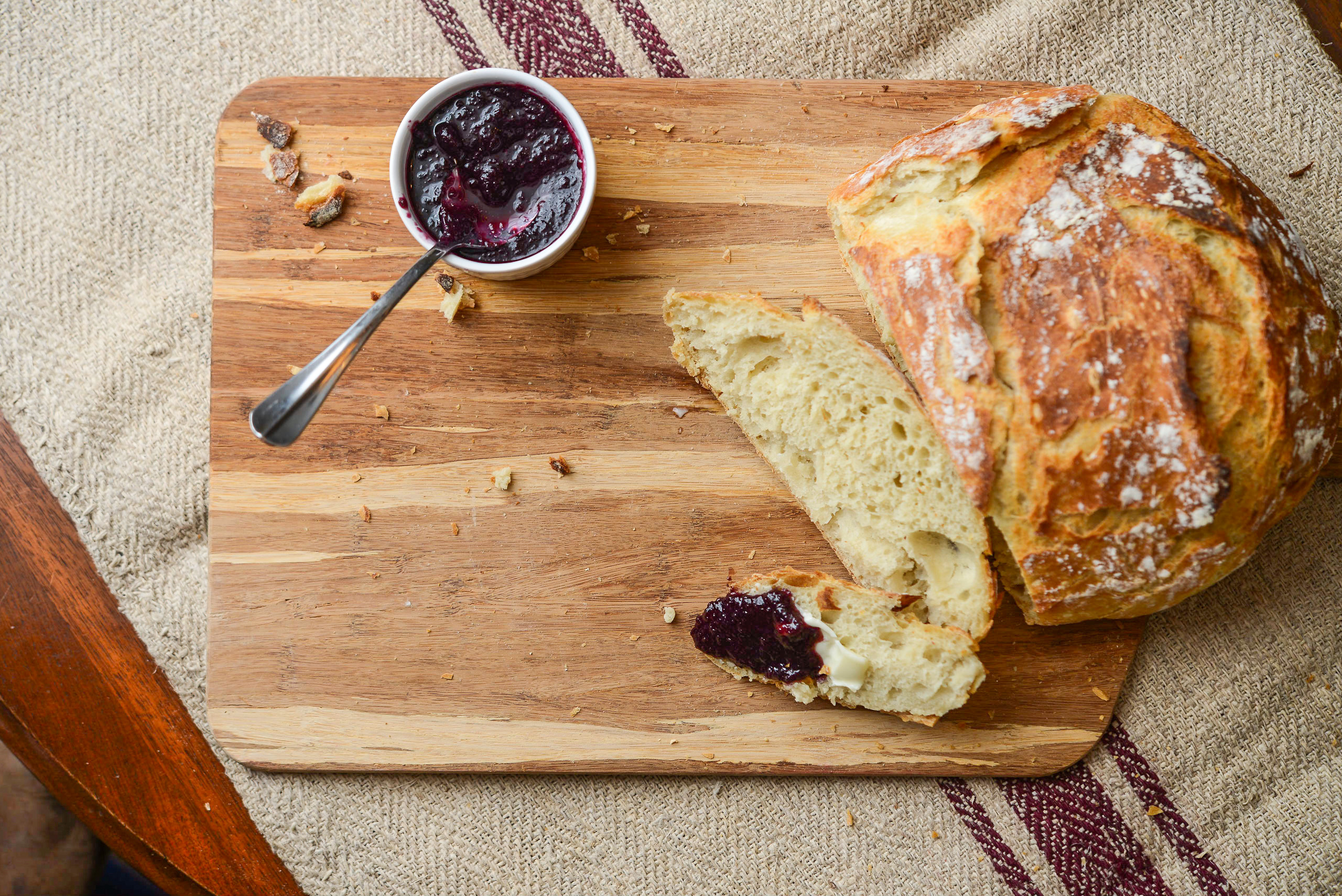 13. Remove the Dutch oven from the oven, take the boule out and place it on a baking rack to cool for 5 minutes before slicing. Serve warm with butter and homemade grape preserves.