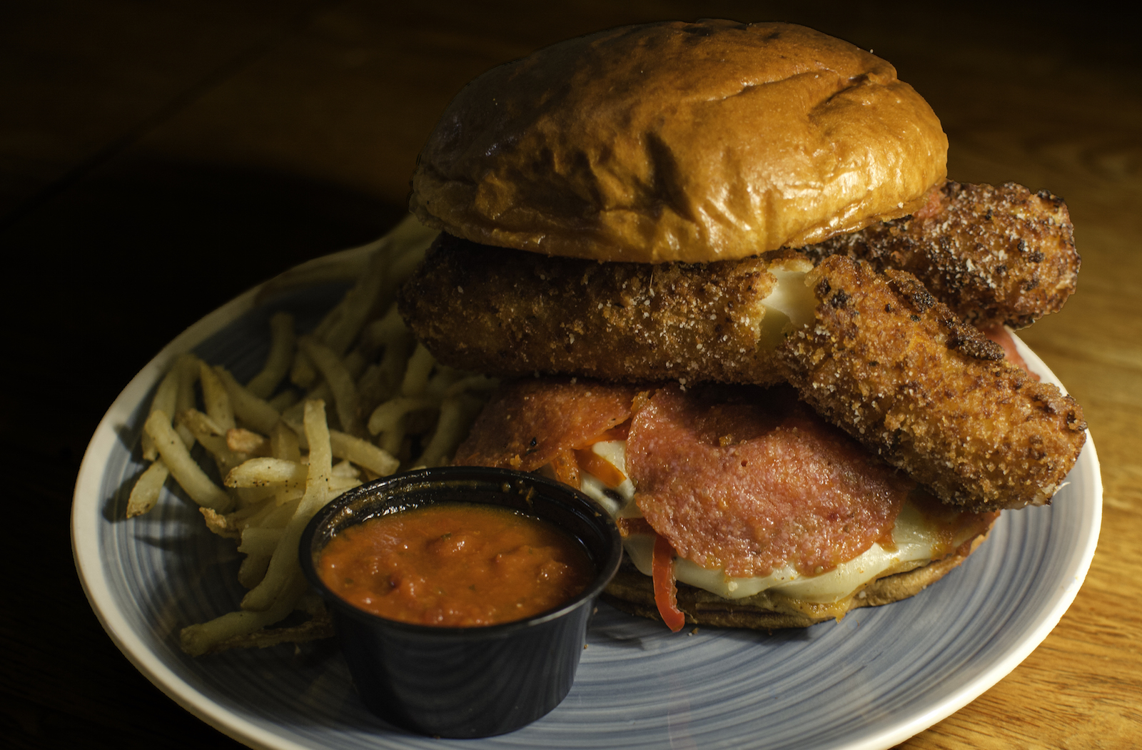 The burger features a half-pound patty topped with fried mozzarella sticks, spicy red peppadew and three giant pepperoni nestled inside a buttery brioche bun. It comes with a small bowl of marinara sauce for dipping, almost insinuating you’ll have to take the burger apart. I was wary of the pizza sauce-and-hamburger combination, but drizzled some marinara on the burger in place of ketchup and was pleasantly surprised at the combination. The mozzarella sticks were mouth-watering on their own, and a toasted brioche bun is great for any burger.