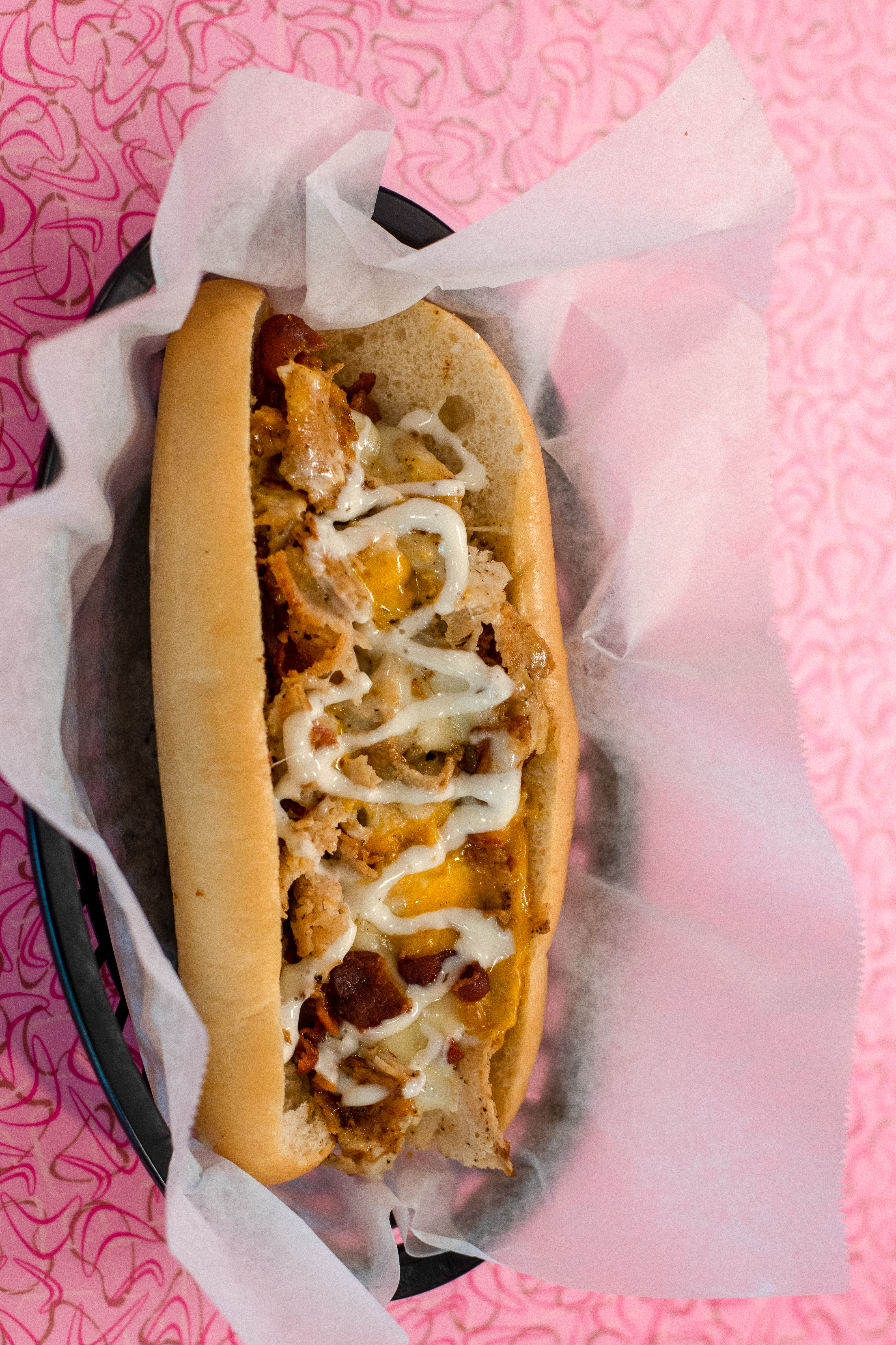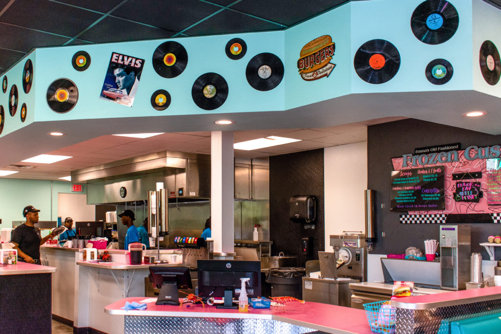 Inside the Baton Rouge diner, bright walls and retro memorabilia are a perfect match for the lively throwback tunes blaring over the speakers. The old-school vibe is completed by large vinyl booths in shades of teal and bubblegum, tabletops with that retro chrome detailing, as well as an open kitchen where diners can watch the cooks blending shakes and plating sandwiches.