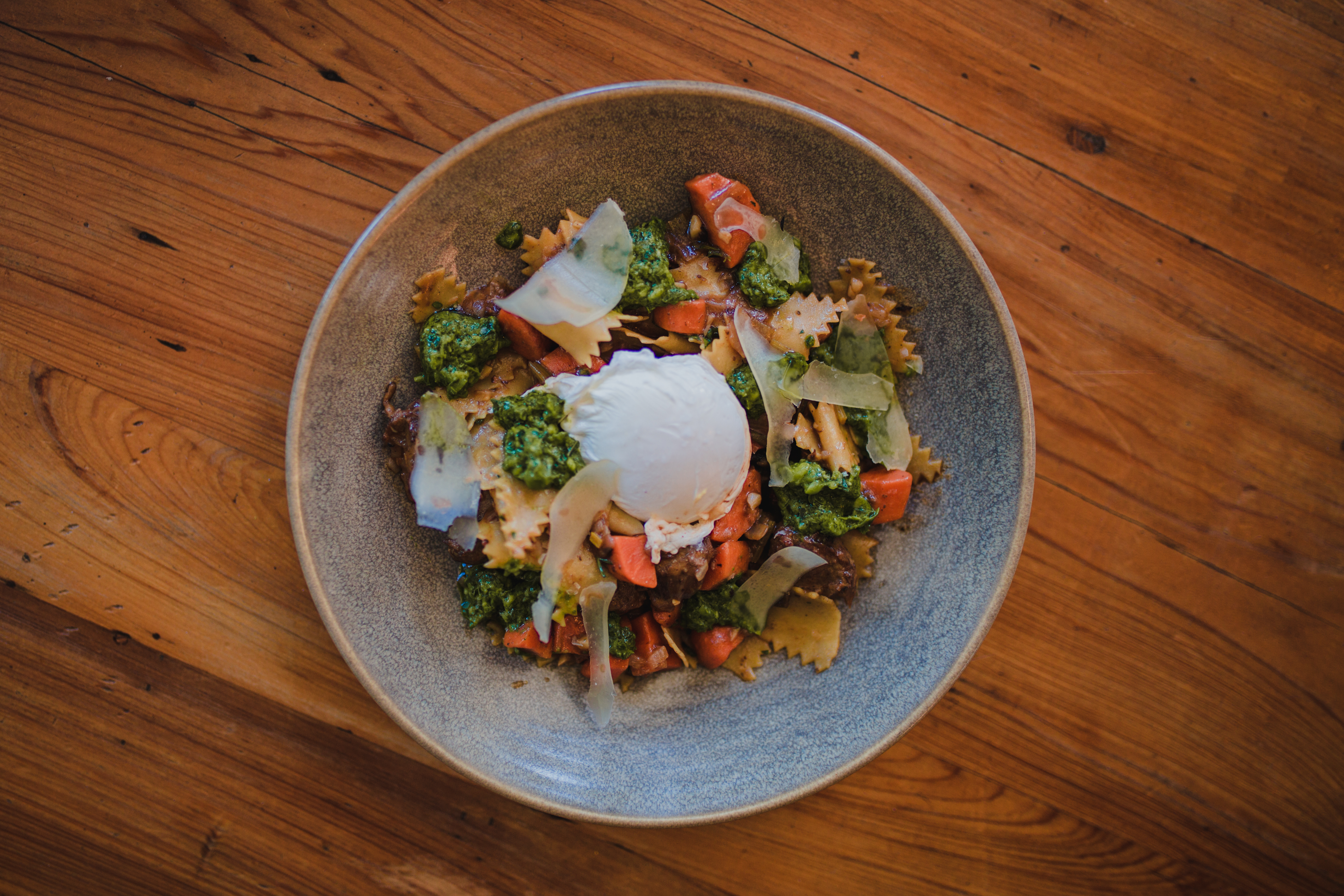 Not only is the plate a feast for the eyes, but the dish itself is hearty and indulgent enough that the $22 price tag starts to makes sense. The braised pork cheeks have that back-of-the-stove depth of flavor reminiscent of mom’s roast, and the house-made, rough-torn pasta creates a base that feels just as down-home and handmade. A bright pea pesto keeps things from getting too heavy, while the runny yolk from a poached egg binds it all together.