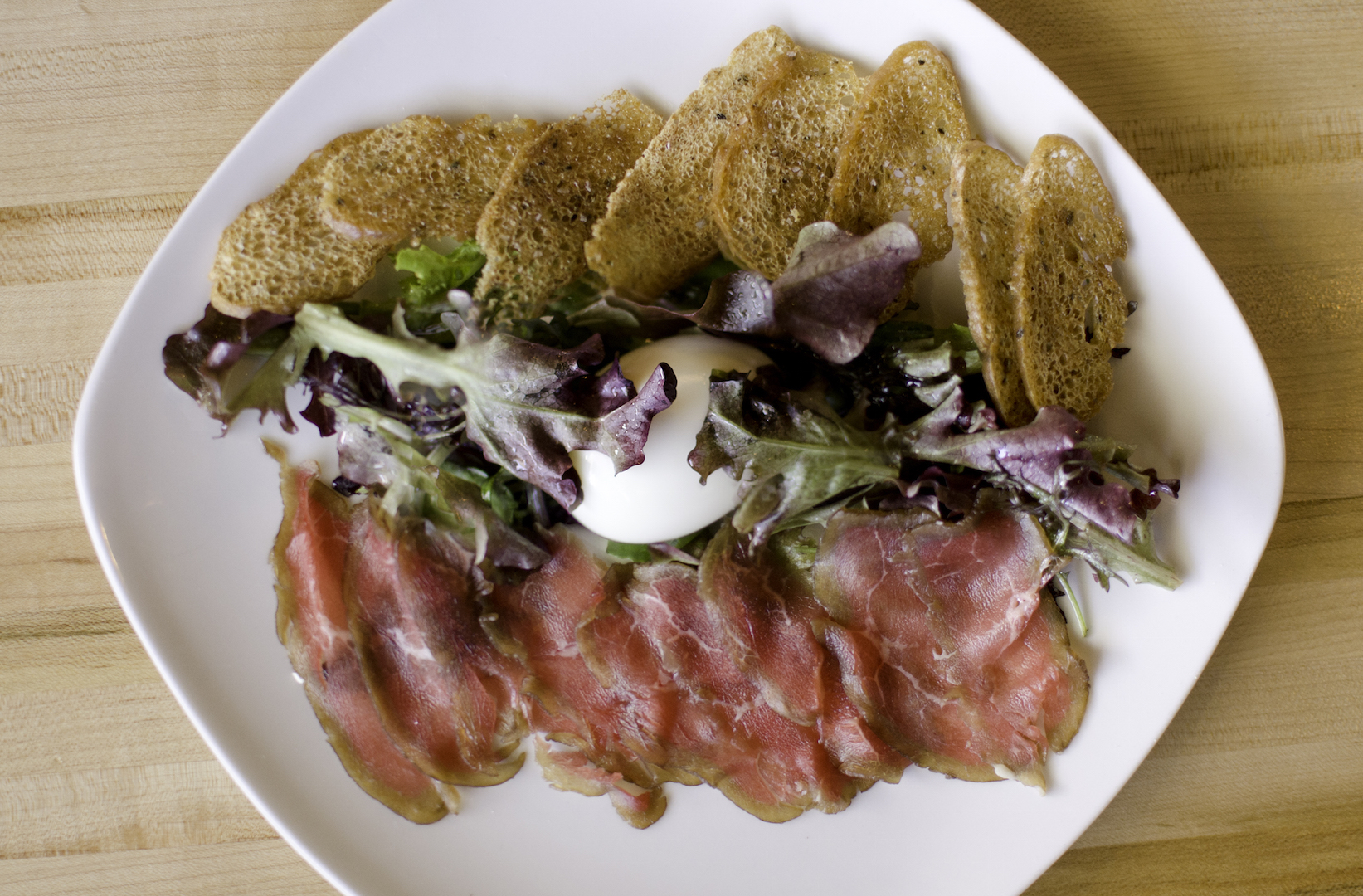 For keeping your lunch break quick and breezy, the carpaccio salad jumps off the menu with a combination of greens, migas and egg. Don’t expect a bed of lettuce, though. The traditional Italian carpaccio is a raw meat dish served up in thin slices, and this rendition comes with a delicate addition of arugula and other spring greens.