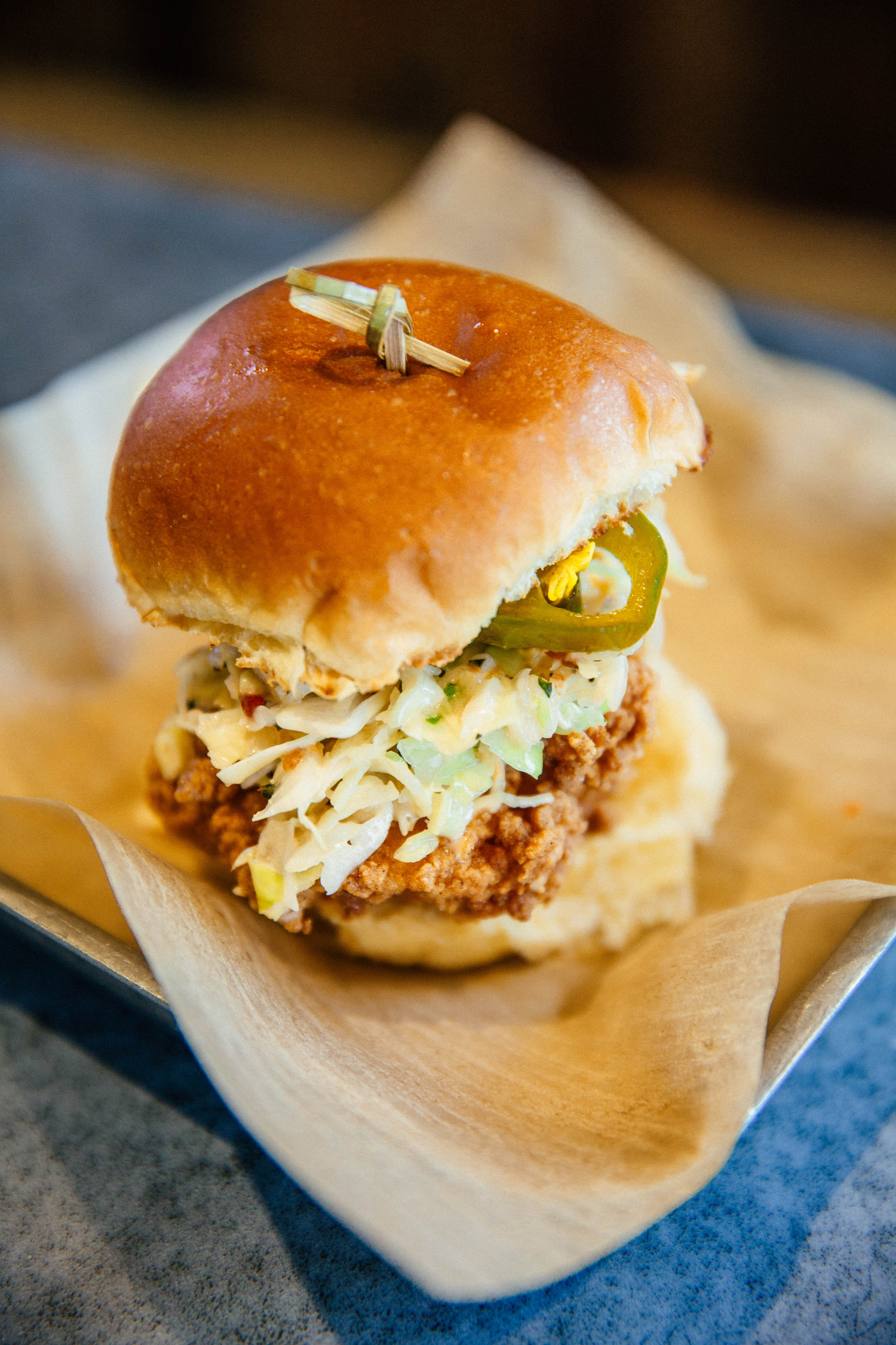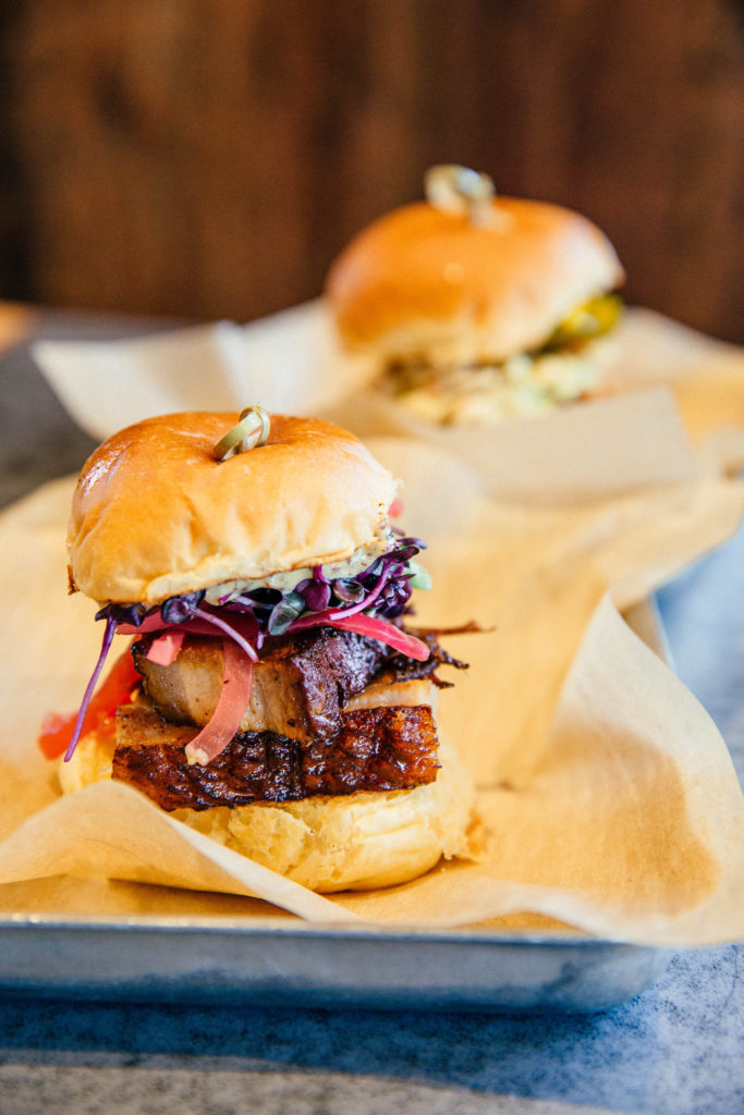 The Chicken Slider comes stuffed with a crispy fried chicken thigh, a sweet and spicy slaw and candied jalapeño, while the Pork Belly Slider is stacked with roasted pork belly, pickled onion, micro radish sprouts and a roasted garlic-anise creole mustard. The candied jalapeño on the chicken adds a level of sweetness that plays off sweet notes in the slaw to layer up the already salty, savory chicken for a well-rounded slider that’s both creative and approachable.
