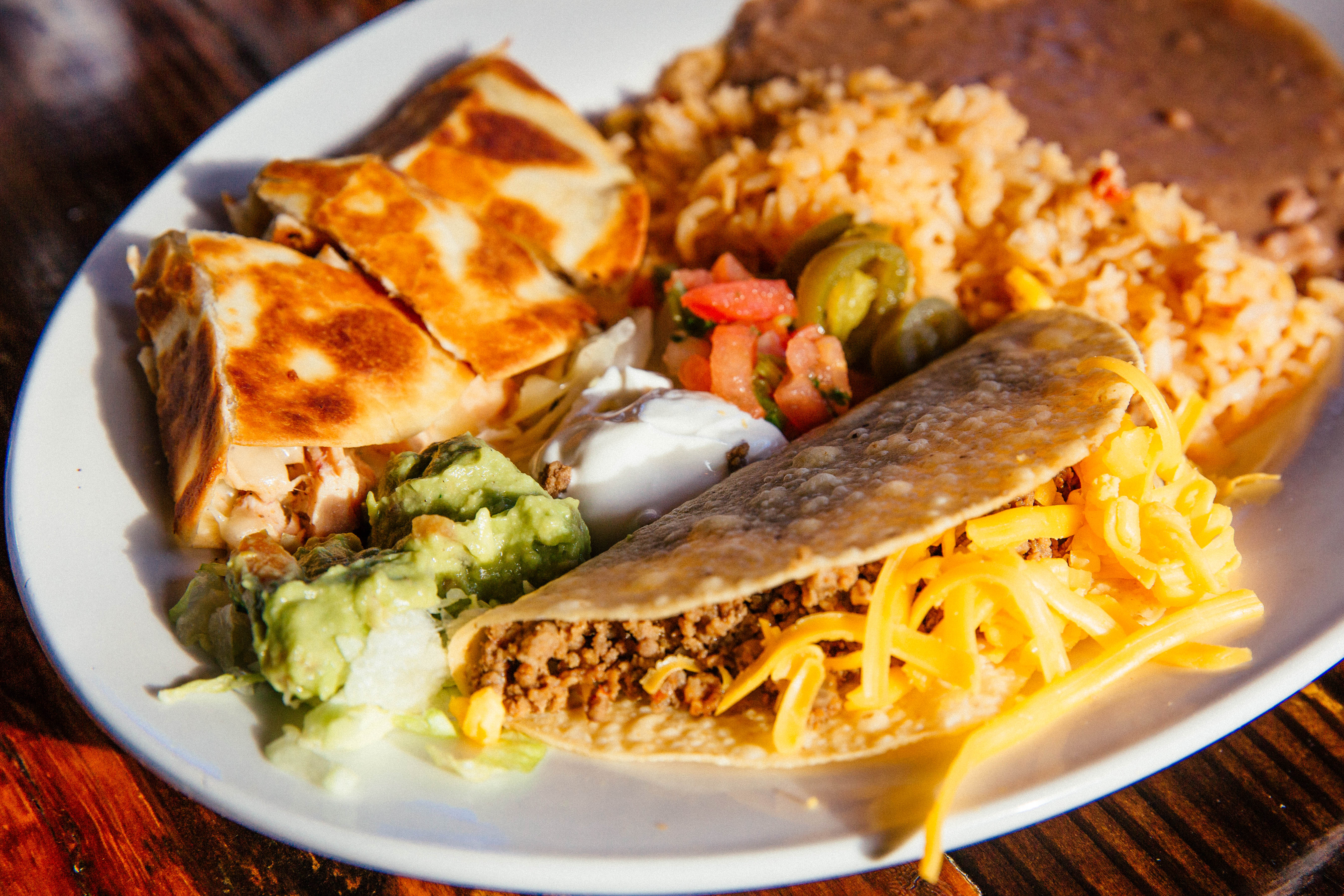 The chicken quesadilla was crispy and buttery. We added cheese and sour cream to the beef taco, which was presented more like an open-faced salad with lots of shredded lettuce and diced tomato. With its hard shell taco, the dish made for a crunchy, creamy, messy-in-the-best-kind-of-way meal.
