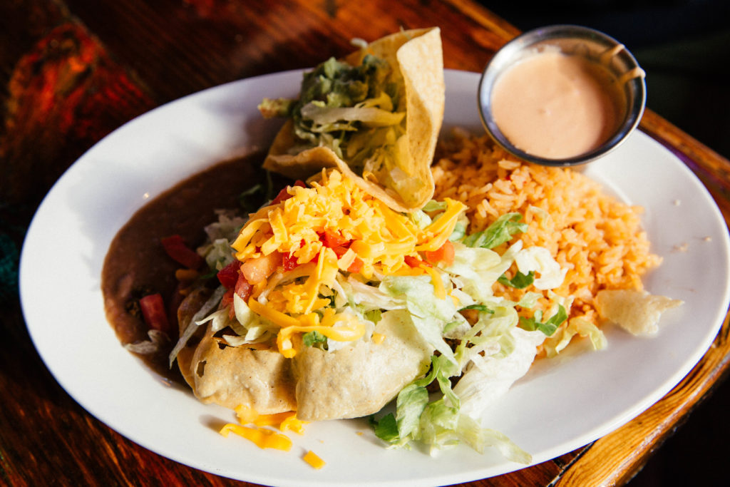 As we munched on chips and salsa, we made selections from the daily lunch menu (served from 11 a.m. to 4 p.m.). We ordered the crispy puff taco with house dressing and the beef taco/chicken quesadilla combo. Both meals came with Spanish rice and refried beans.