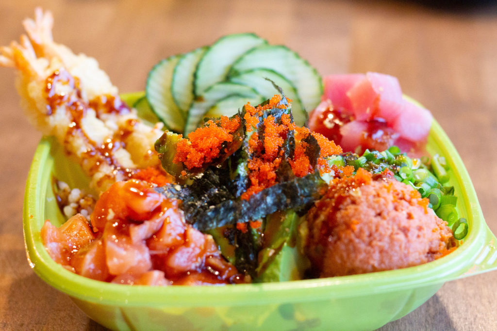 The poke bowls are just as colorful as the sushi rolls. You can build your own bowl or order one of the shop specials like the Poke Bake, which comes with flame-seared ahi tuna, sweet onion, green onion, Tobiko, poke sauce, Ponzu citrus sauce, spicy mayo and roasted garlic. For another non-raw option, customers can try the Dragon Bowl, made with shrimp tempura, surimi crab, cucumber, avocado, tempura crunch, teriyaki sauce and Sriracha.