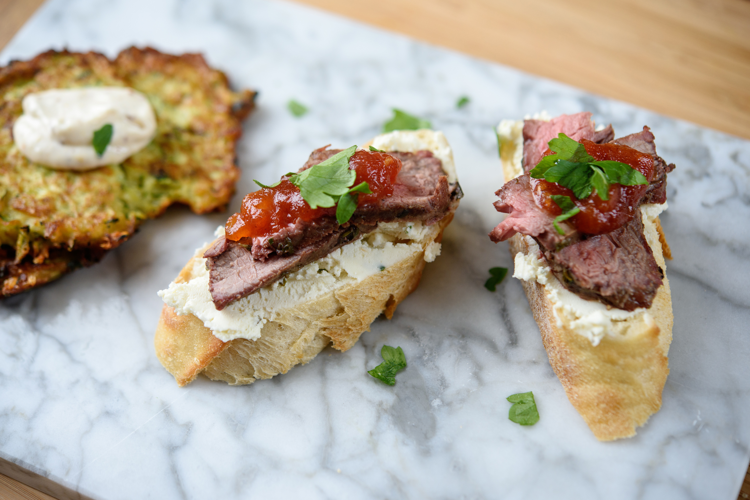 It’s an entree of Flat Iron Steak Crostini with Creole Tomato Jam.
