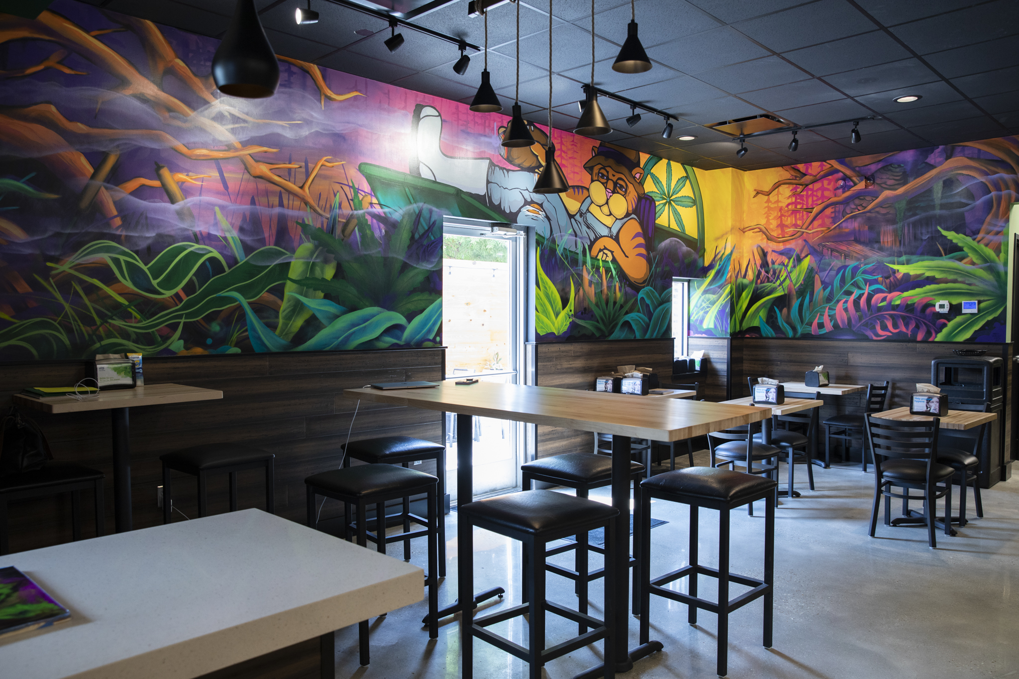 And just like its owners, there’s more to Cheba Hut than meets the eye. The Louisiana “joint” makes its premise evident from the moment you walk through the door: hemp leaf-shaped decor, a drink machine sign reading “cotton mouth cures,” paintings featuring characters like a bird smoking a blunt and a blazed-looking tiger (with puffy purple eyes, of course). The funky atmosphere is amplified through neon artwork and a sticker wall by the counter where customers can add their own personal touches.