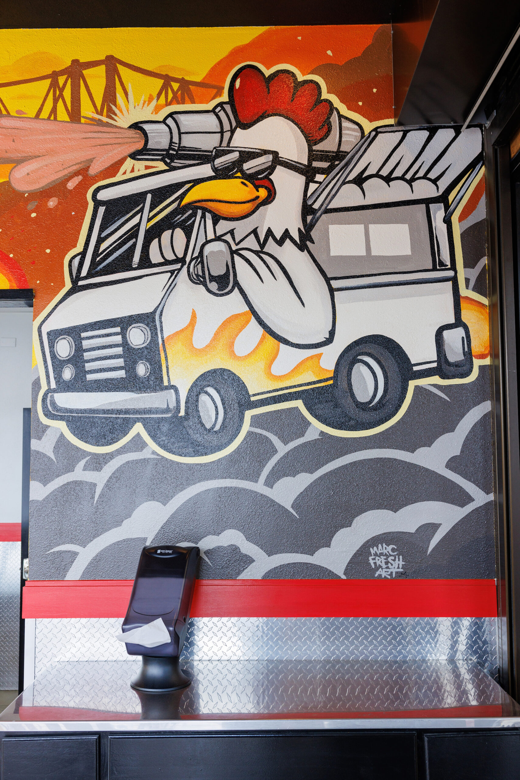 Outside the muralist also left his mark on the drive-thru with another chicken portrait—this time, surrounded by the restaurant’s name in flaming graffiti letters.