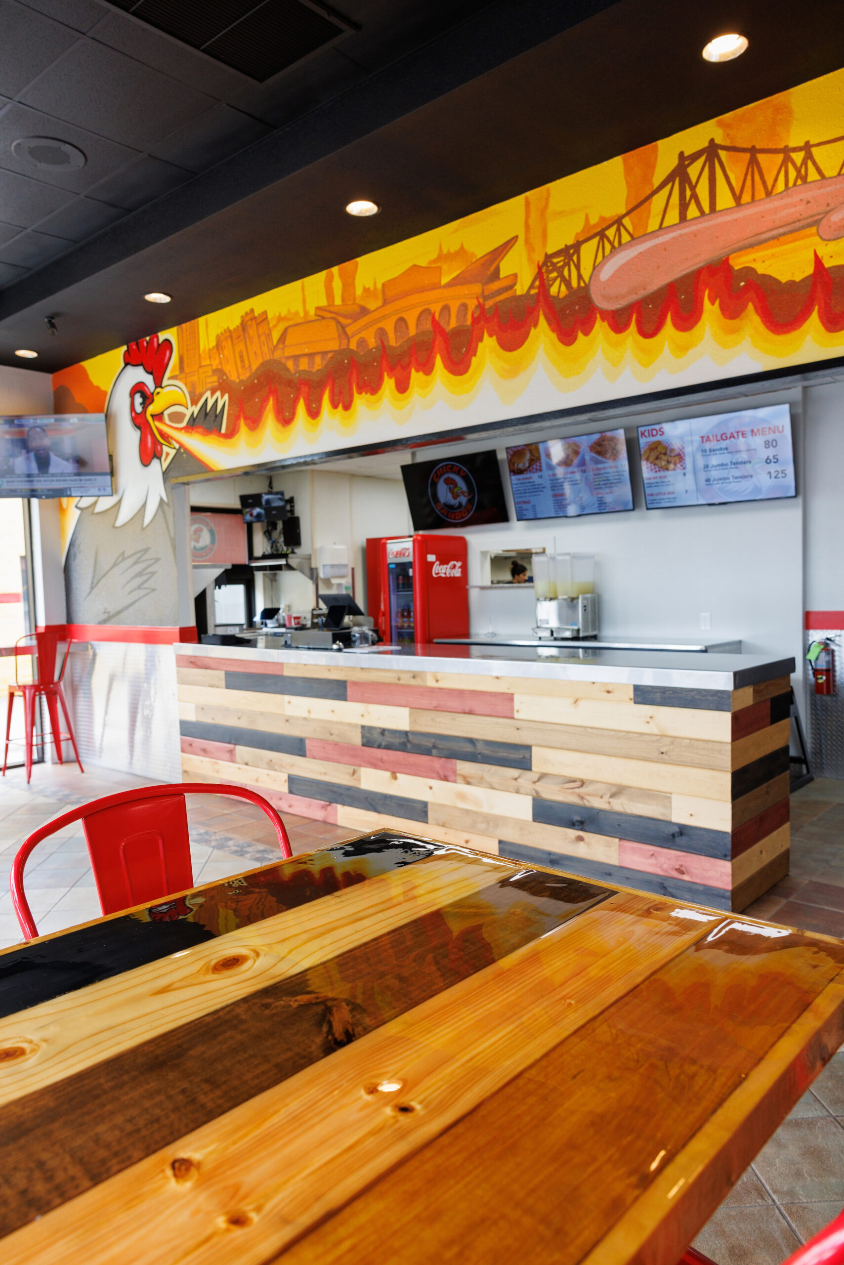 Inside patrons will find seating options for about 12 diners along with a counter to place orders. Walls are covered in a mural by Marc Fresh depicting a Godzilla-sized chicken breathing fire on Baton Rouge landmarks and a cool, hero chicken attempting to extinguish the flames with a cannon of the eatery’s signature Sando Sauce.