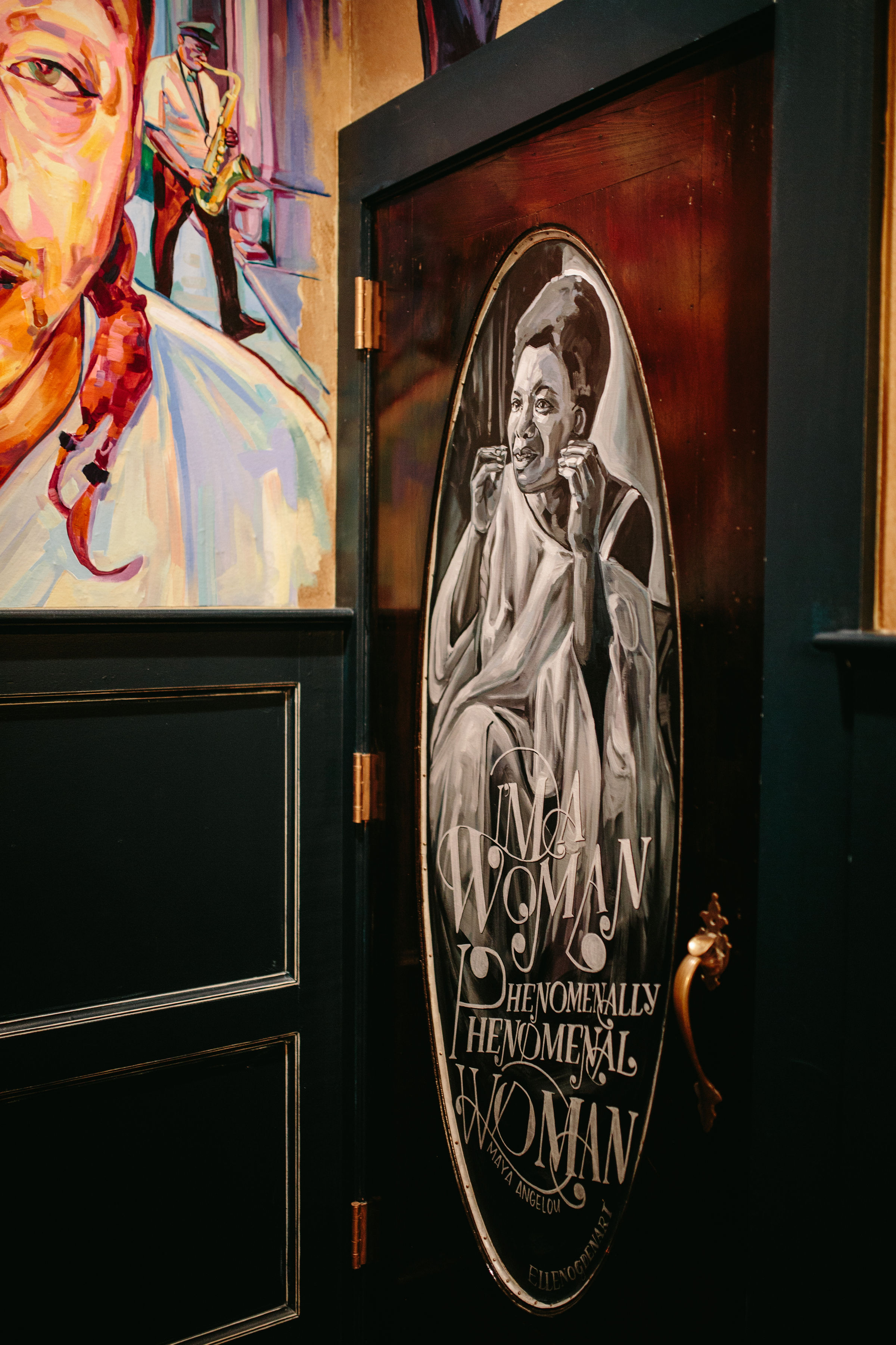 “We were shown the space, and we knew we wanted to do something extraordinary for the LSU student body and the city as a whole,” DeMatteo says. “The ‘dead poet’ theme came about because we knew we wanted to tie in school and academics without being overtly LSU. So we started talking about what we studied in school, which led us to English and poetry, which eventually led to this open theme of poets, artists, writers and musicians who have died.”