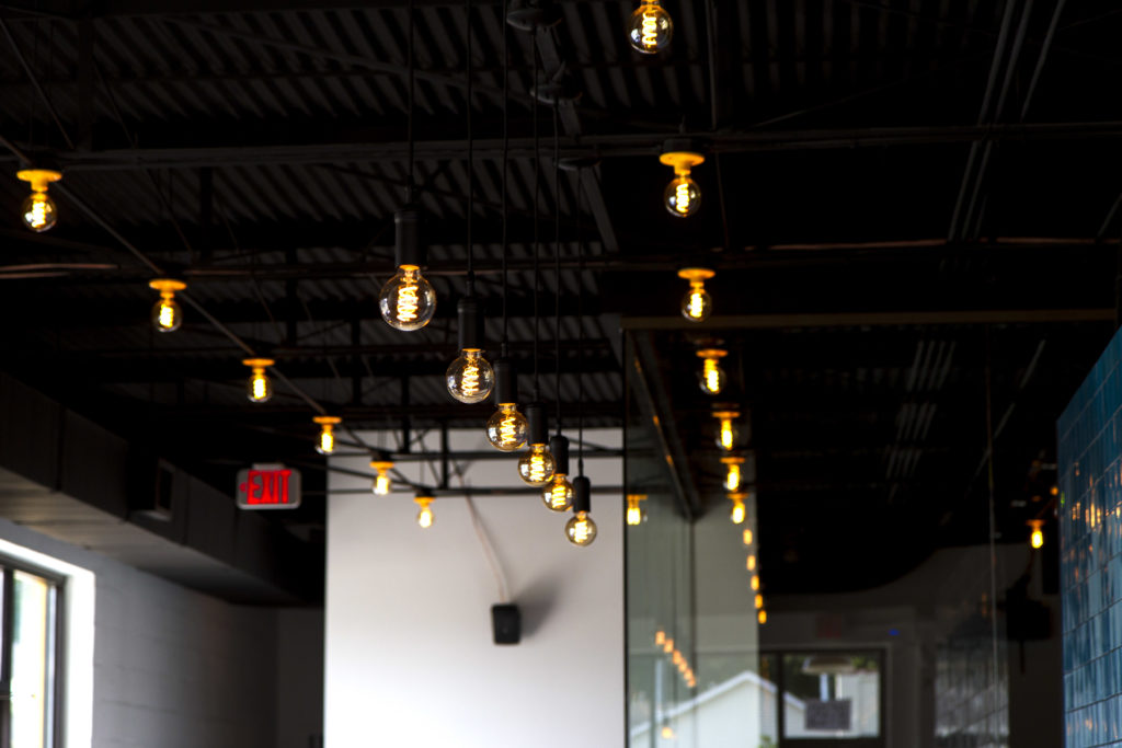 The interior features bright blue brick walls and high, exposed ceilings with hanging Edison bulbs, along with a tiled bar and wooden counter. The goal is to have a sophisticated feel without seeming unapproachable or pretentious, Meeker says. It’s light and open, with a modern and minimalist vibe that’s still fun.