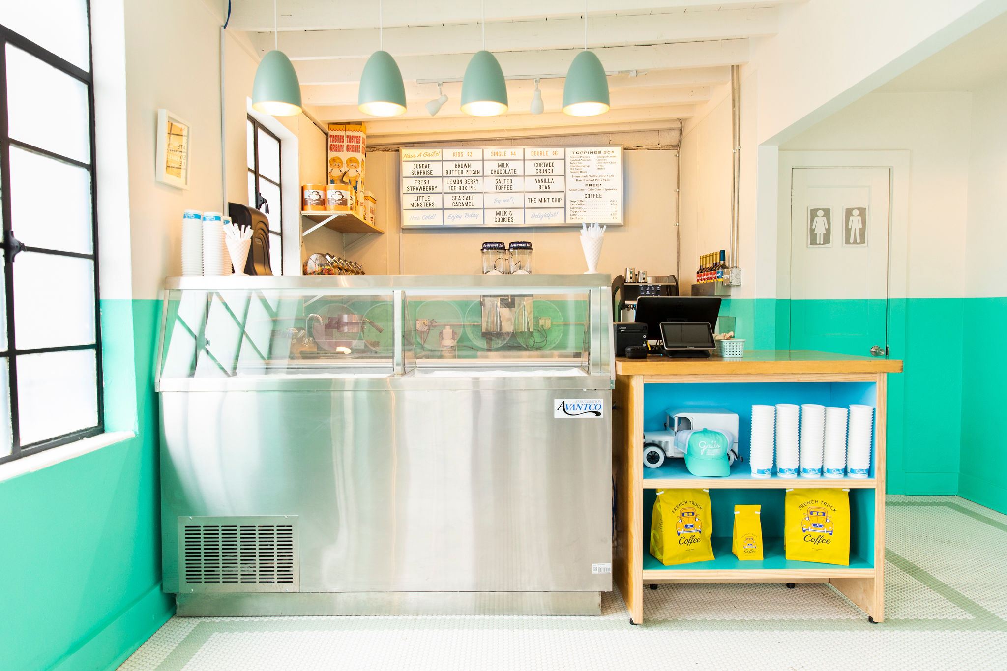 The concept is both elevated and nostalgic. A friendly color palette in cool hues signals simplicity and childhood innocence. But wrapped in the disarming vibe is carefully made ice cream meant to stand out for its rich, creamy texture and inventive flavors.