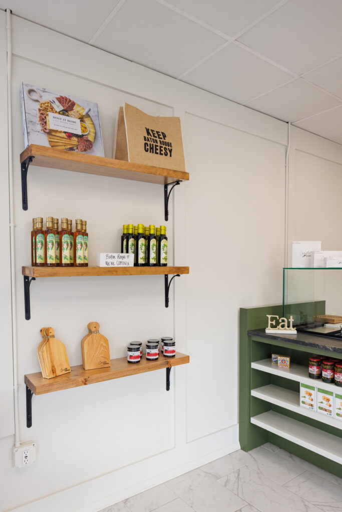 The star of the store, of course, is the hunter-green charcuterie bar with a light-up acrylic sign that reads “Life is gouda” in gold letters. This Chipotle-style prep table will soon be filled with rotating artisan cheeses, specialty meats, nuts, seasonal fruits and other charcuterie pairings. Condiments will include Louisiana-made Lena Farms pepper jelly, locally made honey and romesco (a tomato-based spread). The build-your-own cheese box bar will also feature dairy-free and gluten-free options.