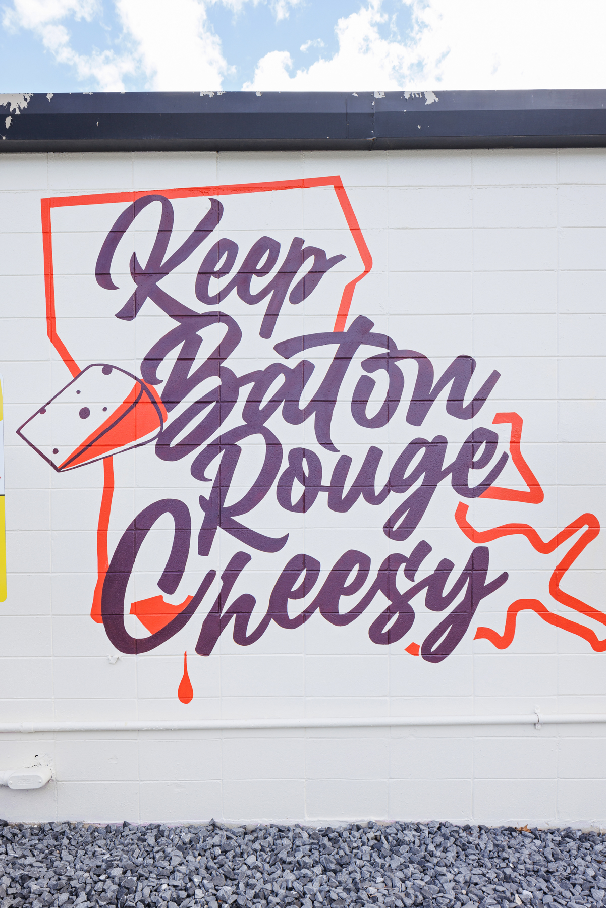 The mother-and-daughter duo have plotted a charcuterie shop with customizable cheese boxes of all sizes. And the aesthetic is as cheesy and local as it gets. At the entrance, visitors are greeted with a dark-orange cheese-inspired mailbox painted by muralist Marc Fresh and a charcuterie-themed window decal by Vivid Ink Graphics. The building’s signage is also painted by none other than—you guessed it—Marc Fresh, with a mural that says “Keep Baton Rouge Cheesy” outlined by the shape of the state of Louisiana.